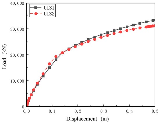 Figure 3 presents the two load–displacement curves obtained from the computations. The verification results show that, under all specified cases, the ultimate bearing capacity of the anchoring foundation Rc is significantly greater than the corresponding design load Td (i.e., Rc > Td). This indicates that the currently designed parameters—pile-anchor geometry, material strengths, and pad-eye configuration—satisfy design-code requirements and provide a certain safety margin.