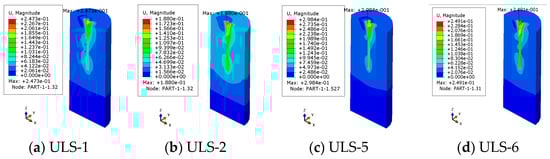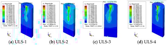 Comparison of soil displacement distributions under various ultimate limit state (ULS) conditions: (a) ULS-1; (b) ULS-2; (c) ULS-5; (d) ULS-6.