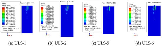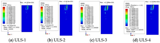 Comparison of equivalent plastic strain of soil under various ultimate limit state (ULS) conditions: (a) ULS-1; (b) ULS-2; (c) ULS-5; (d) ULS-6.