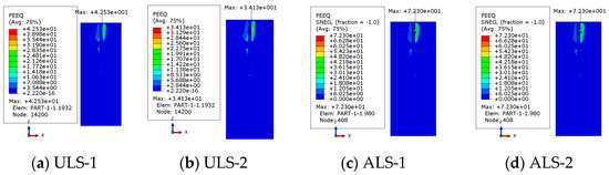 Figure 9 provides the displacement-vector plots and equivalent plastic-strain contours. Comparison of the equivalent plastic-strain distributions under ULS and ALS indicates consistency in the overall failure pattern: a passive failure wedge forms in the windward soil in front of the pile, with plastic-strain concentration near the pile–soil interface. However, pronounced differences arise in the range and intensity of strain concentration across cases. In ULS-1 and ULS-2, the plastic-strain zone is primarily confined to the windward side of the upper pile; strains behind and beneath the pile are comparatively weaker, indicating a limited failure extent and overall stable bearing performance of the pile foundation. In ALS-1 and ALS-2, due to the increased applied load and the offset effect associated with the angle to the XZ plane, the plastic-strain band expands markedly—not only enlarging in front of the pile on the windward side but also showing stronger strain accumulation locally behind the pile—indicating a more complex and asymmetric failure tendency. In addition, under ALS the concentration of strain at the pile–soil interface intensifies significantly, suggesting that the pile foundation is more prone to local yielding and even instability under extreme loading.