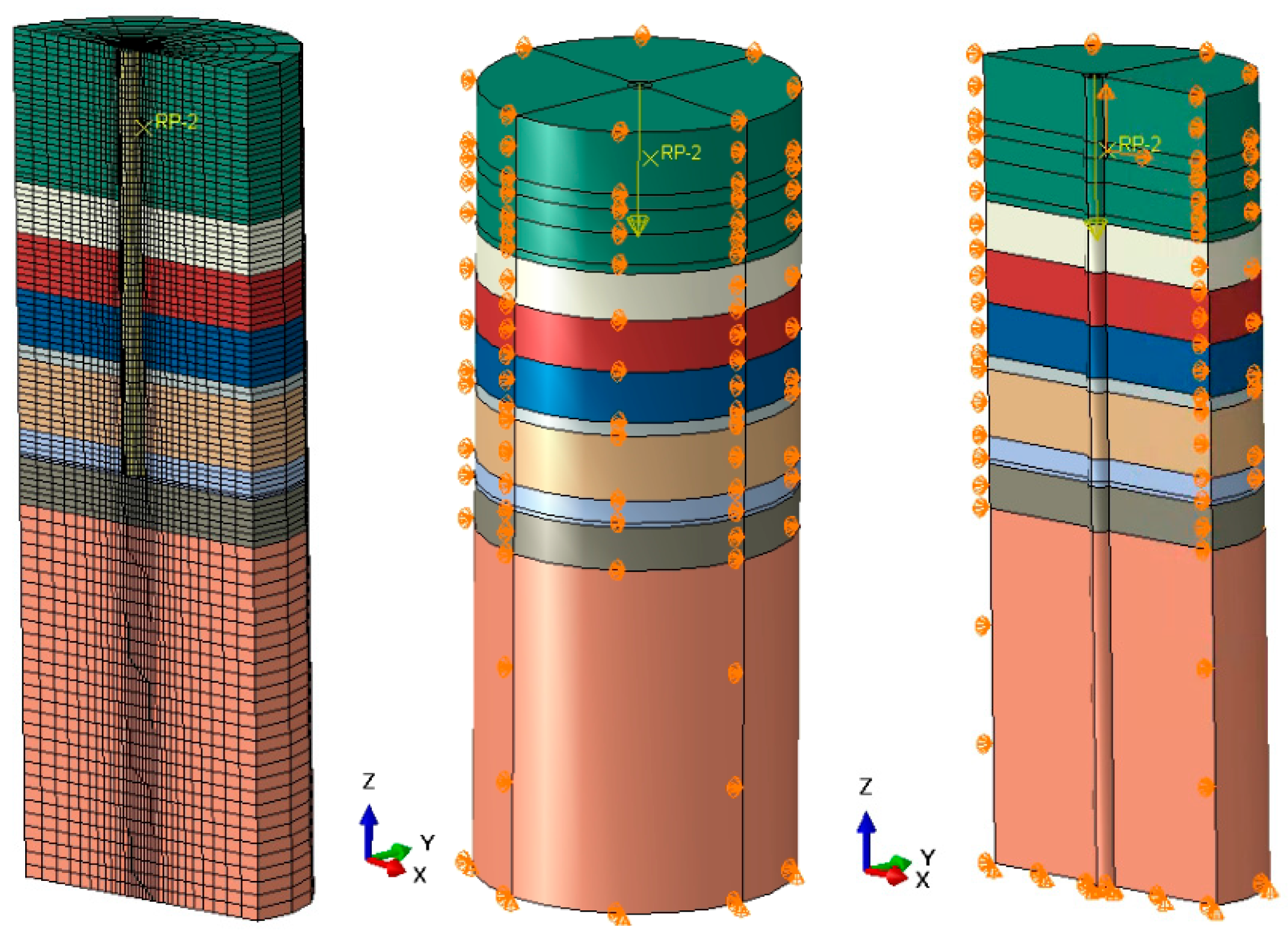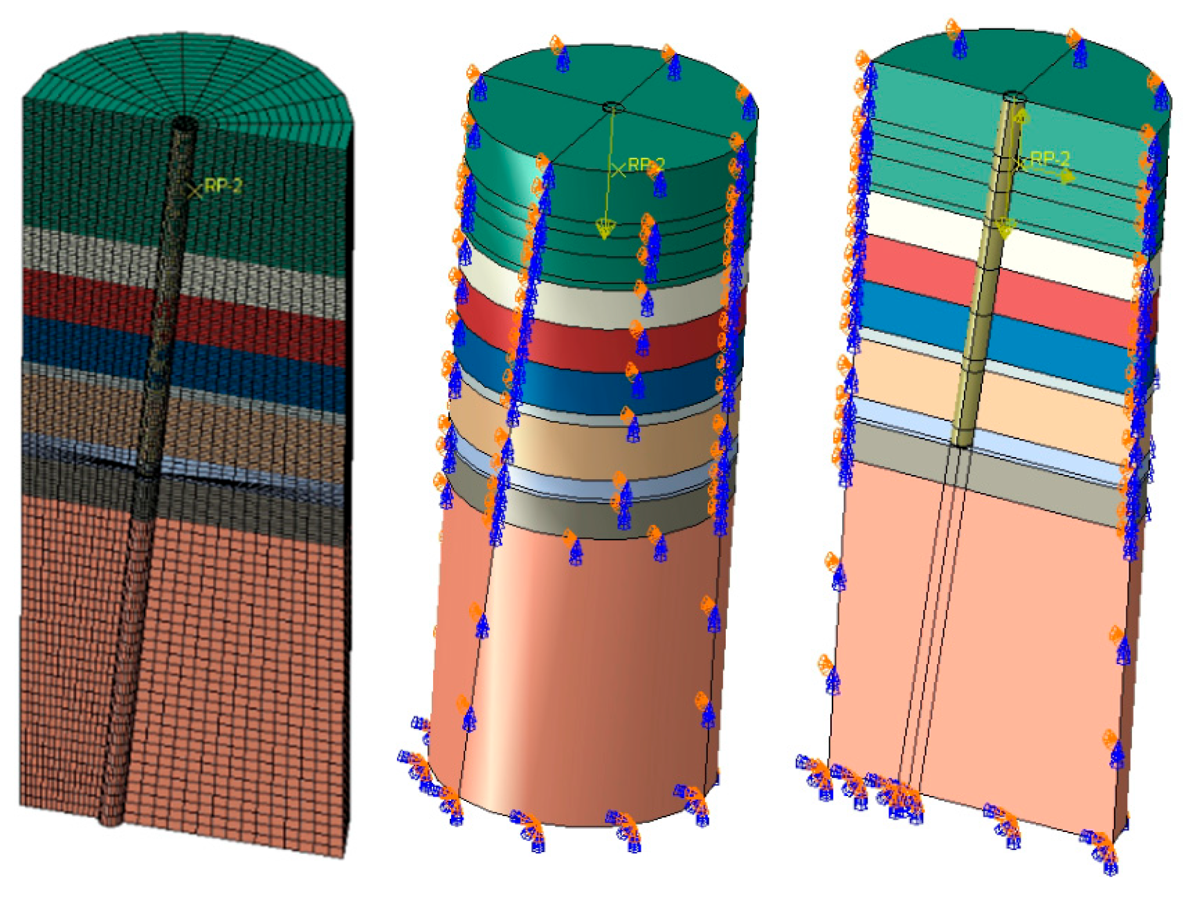 Foundation out-of-level refers to the levelness state of the anchoring foundation after construction, i.e., the degree of deviation between the foundation top surface or critical installation plane and the horizontal plane. It is one of the key indicators for assessing construction quality and directly affects the stress state and long-term service performance of the anchoring foundation. In deep-water environments, the construction of pile-anchor foundations mainly relies on vibratory driving, impact driving, or bored piling with post-grouting. During construction, due to vessel motion, ocean currents, and limitations in installation-equipment precision, the top-surface levelness of the pile often fails to meet design requirements. Out-of-level typically manifests as an angular deviation between the pile-top surface and the horizontal reference plane; it can usually be controlled within 0.5–2° but may reach 3–5° under complex sea states. In this study, an installation error of 5° is considered. The ABAQUS computational model is shown in