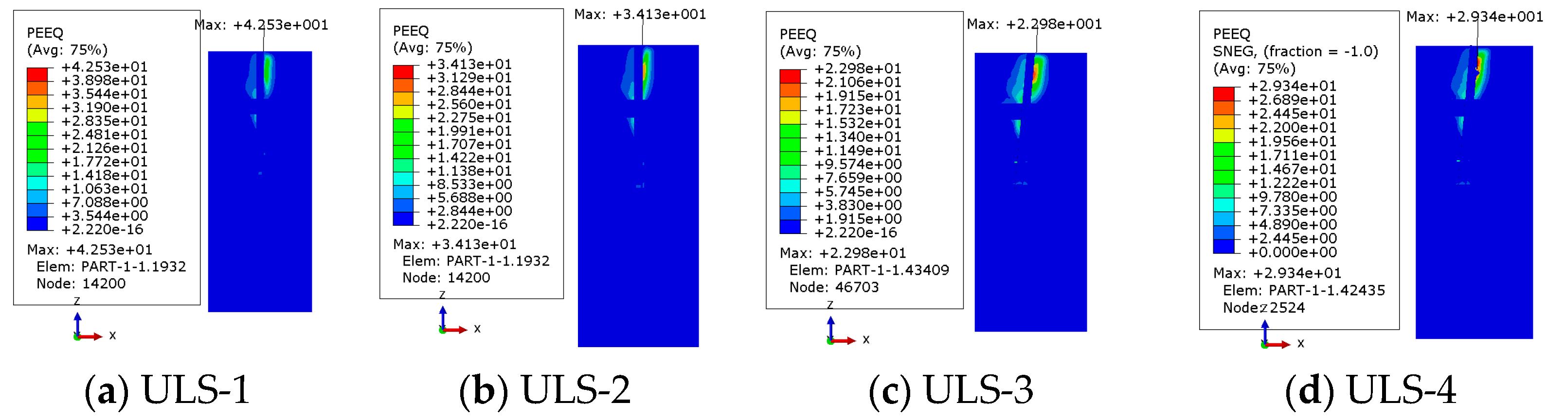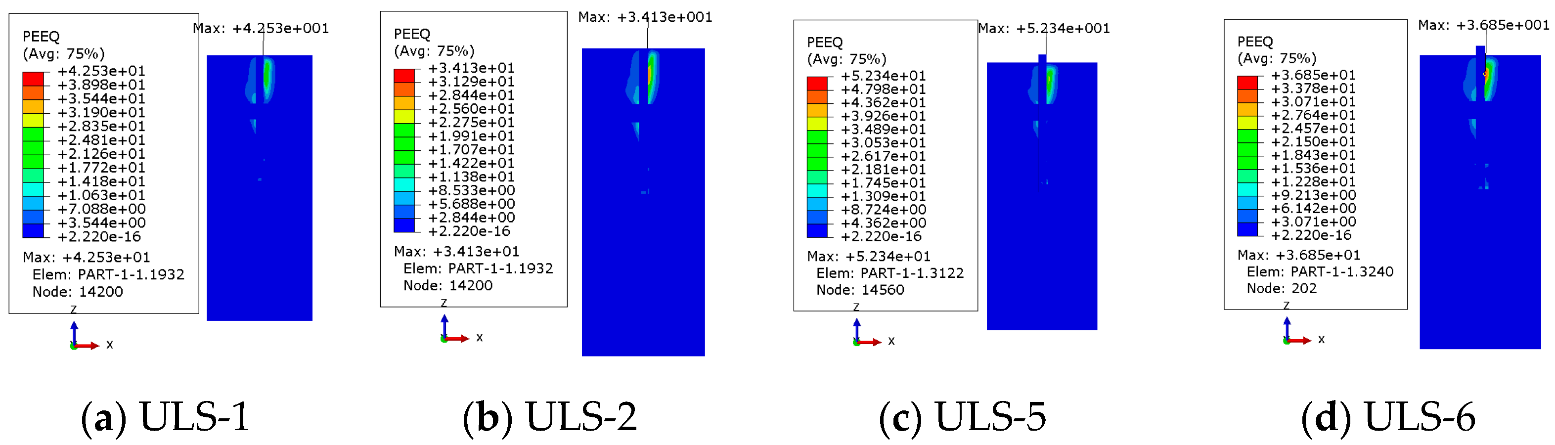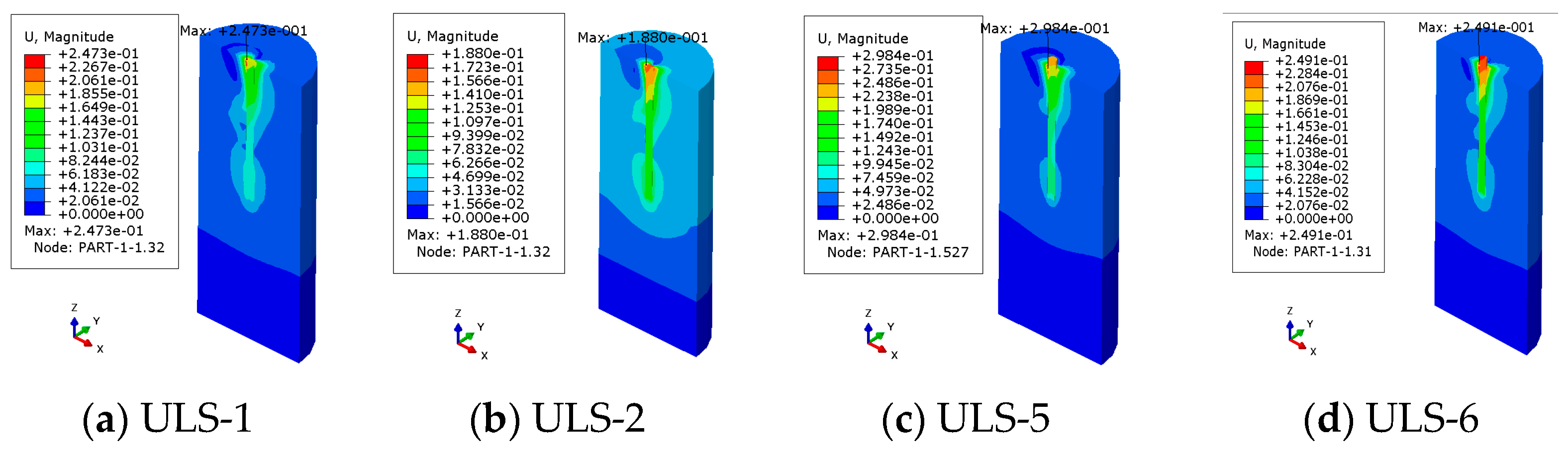 Figure 9 provides the displacement-vector plots and equivalent plastic-strain contours. Comparison of the equivalent plastic-strain distributions under ULS and ALS indicates consistency in the overall failure pattern: a passive failure wedge forms in the windward soil in front of the pile, with plastic-strain concentration near the pile–soil interface. However, pronounced differences arise in the range and intensity of strain concentration across cases. In ULS-1 and ULS-2, the plastic-strain zone is primarily confined to the windward side of the upper pile; strains behind and beneath the pile are comparatively weaker, indicating a limited failure extent and overall stable bearing performance of the pile foundation. In ALS-1 and ALS-2, due to the increased applied load and the offset effect associated with the angle to the XZ plane, the plastic-strain band expands markedly—not only enlarging in front of the pile on the windward side but also showing stronger strain accumulation locally behind the pile—indicating a more complex and asymmetric failure tendency. In addition, under ALS the concentration of strain at the pile–soil interface intensifies significantly, suggesting that the pile foundation is more prone to local yielding and even instability under extreme loading.