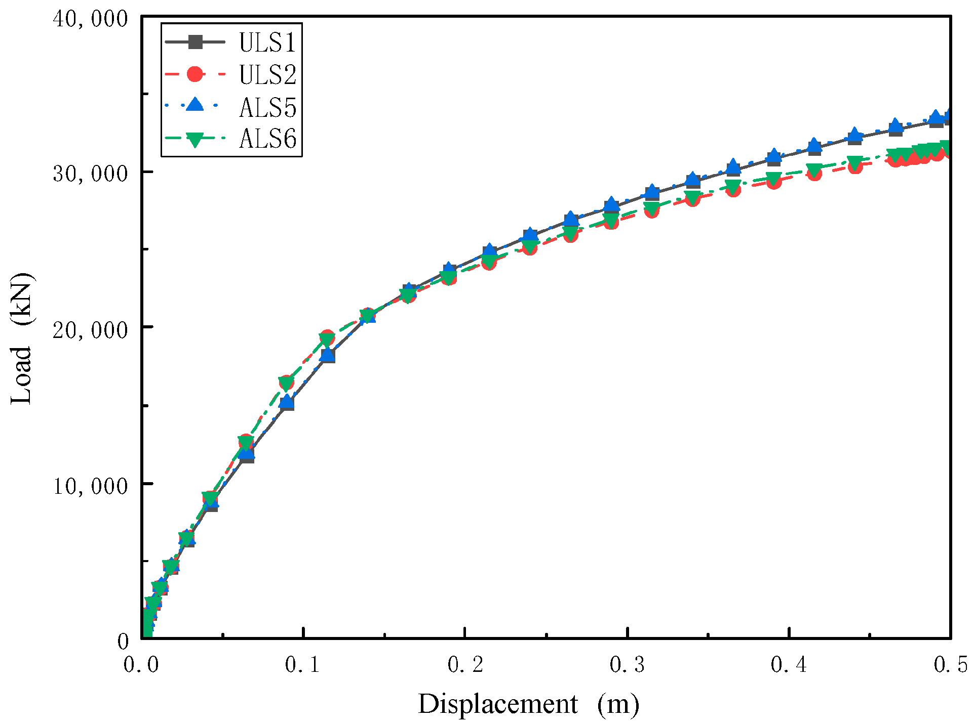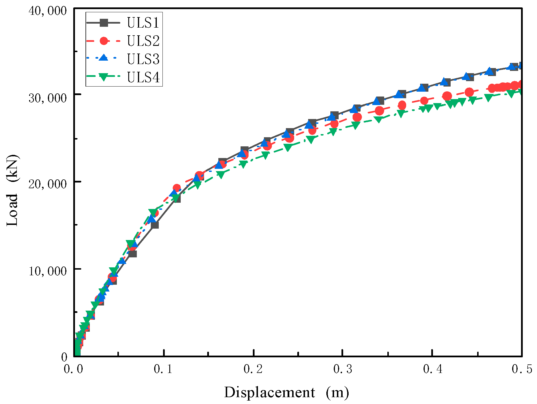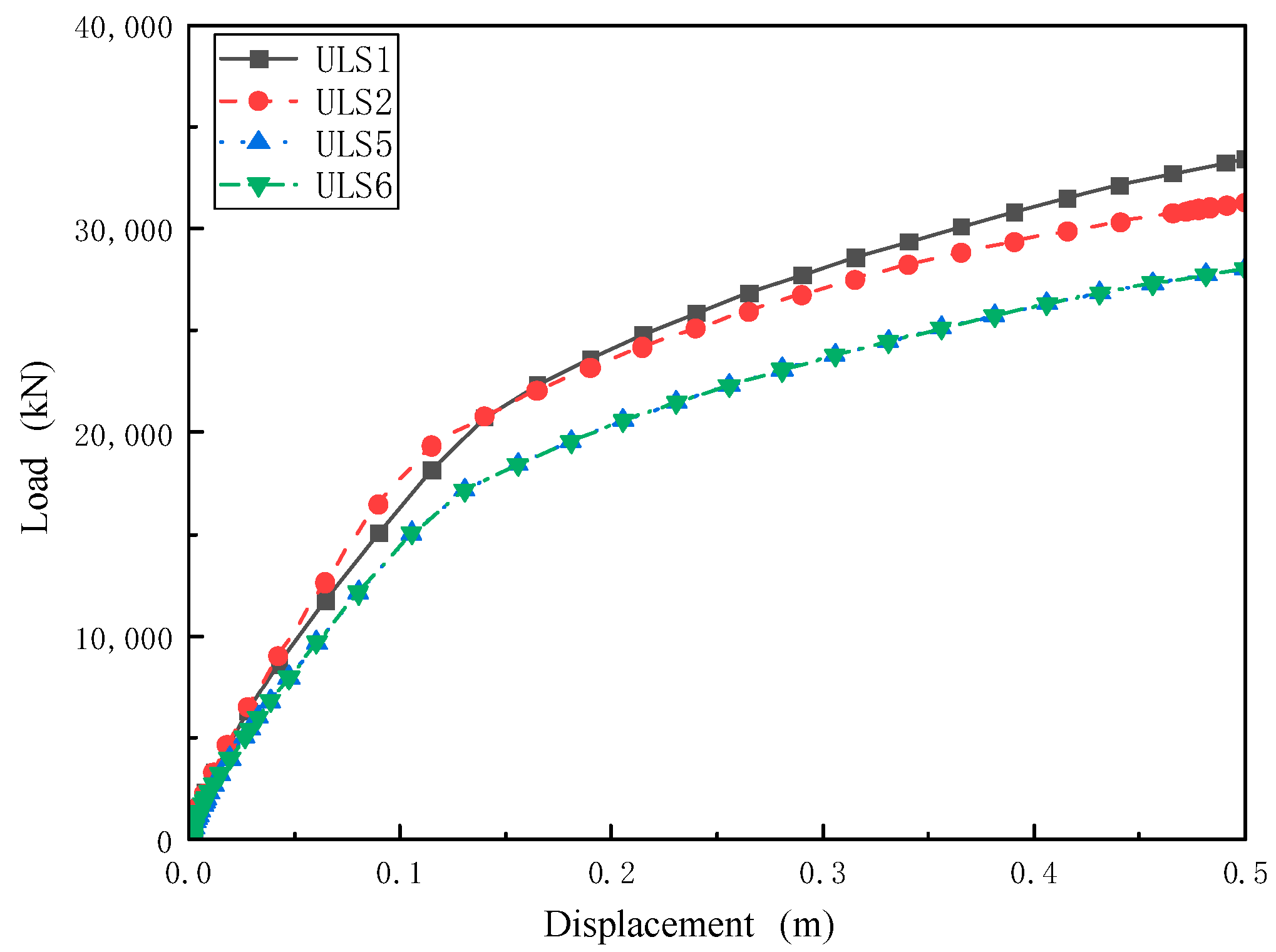 Figure 10 shows the load–displacement curves for the four cases. All four curves indicate that the pile-anchor bearing resistance increases with displacement and tends to grow linearly after 0.2 m; the ultimate resistance in all cases does not exceed 35,000 kN. This behaviour suggests a distinct initial stage of nonlinear consolidation and frictional-resistance mobilization, followed by a more stable bearing stage.