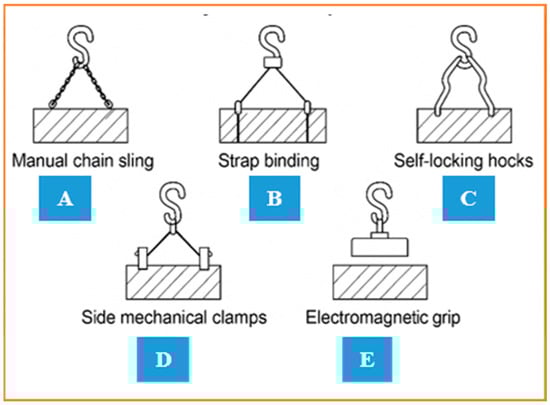 Typical techniques used for attaching a pallet or bundled load to the crane hook in a warehouse. (A) Manual chain sling; (B) strap binding; (C) Self-locking hocks; (D) Side mechanical clams; (E) Electromagnetic grip. Own elaboration.
