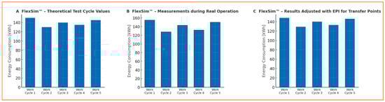 Comparison of simulated and actual energy consumption values for the reception and order-picking cycle of a crane. The charts illustrate: (A) theoretical energy calculated based on the standard test cycle, (B) energy consumption measured during actual crane operation, and (C) results corrected using the EPI for TPs. The charts were developed in the FlexSim environment.