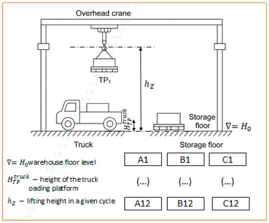Table 2 presents the results of the analysis of the storage area layout in the warehouse for two operating modes: goods receipt and order picking. Both receipt and picking take place within the same designated section of the warehouse, as defined in the WMS. For the purposes of the test cycle, the storage area is divided according to rotation in the WMS (or based on other data, e.g., invoices from a given period) into sections A, B, and C, corresponding to the frequency of retrievals (pallet queueing strategy LIFO or FIFO, as per the WMS). Within each group A, B, and C, the test cycle designates 12 storage locations for individual palletised loads. The transport path runs between the rows of storage locations in sections A, B, and C, as well as between specific storage positions (A6, B6, C6 and A7, B7, C7). This results in three transport aisles running along the storage positions A, B, and C and one aisle at a right angle to them. The truck loading/unloading area, which delivers or collects pallets in the test cycle, is located in front of position B1. It is assumed that the truck floor is parallel to the warehouse floor, with a vertical distance of approximately 1.1 m between the two surfaces (Figure 5). The test cycle does not define the dimensions of storage positions or the widths of transport aisles. The crane starts and ends each of the two operating modes at the same start-stop position.
