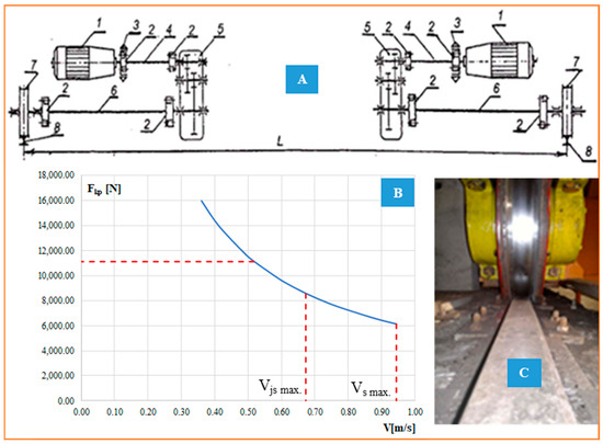 —crane mass 8560 [kg], mw—trolley mass 1160 [kg], —load mass 2500 [kg], —initial speed 0 [m/s], —final speed [m/s], —distance increase 0.1 [m], —weight of the crane with load 108,498.6 [N], —rotating mass coefficient 0.104, —resistance of the crane running system for a 2500 kg load 1479.53 [N], —driving force read from the traction characteristics 11,128.73 [N], Fkw—driving force on the trolley wheels 6238.08 [N], Fwc—driving force on the winch drum 14,566.41 [N].