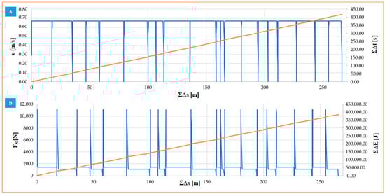 The EPI is described by Equation (23), whereas is defined by Equation (24). Here, denotes the mass of the pallet, represents the efficiency of energy recovery by the crane, and corresponds to the energy associated with pallet positioning (micro-movements of the crane). These micro-movements occur when the material handling equipment transitions from steady-state motion to stopping during the test cycle phase, in accordance with the approach adopted in VDI 2198. represents the energy intensity during dynamic starts, determined by the characteristics of the truck body, including wheel features and parameters. denotes the crane’s energy intensity in standby mode, while represents the energy associated with manual operations, which depends on the complexity of operational tasks (such as crane hook attachment), placement precision, and frictional work.