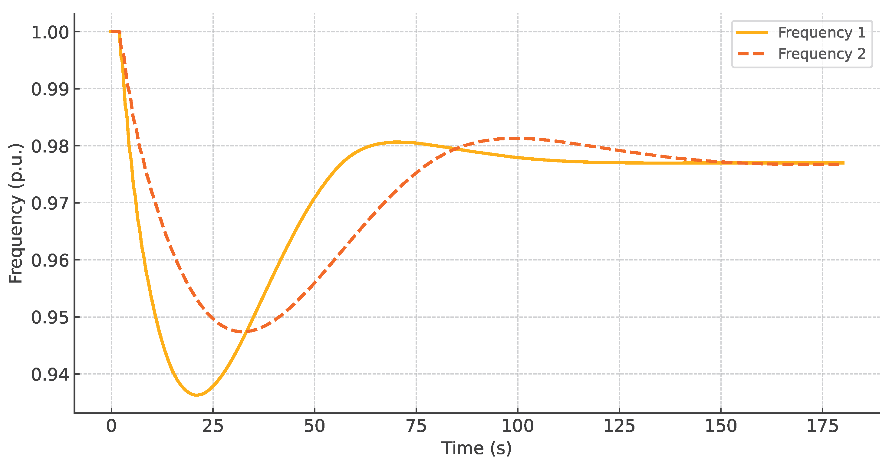 Figure 1 illustrates how frequency is affected by changes in system inertia levels. The curve labeled Frequency 1 corresponds to the IEEE 39-bus system with a 50% loss of inertia, while the curve labeled Frequency 2 represents the same system operating with 100% of its original inertia. A generation-load imbalance results in frequency excursions, and this imbalance is initially counteracted by the system’s inertia