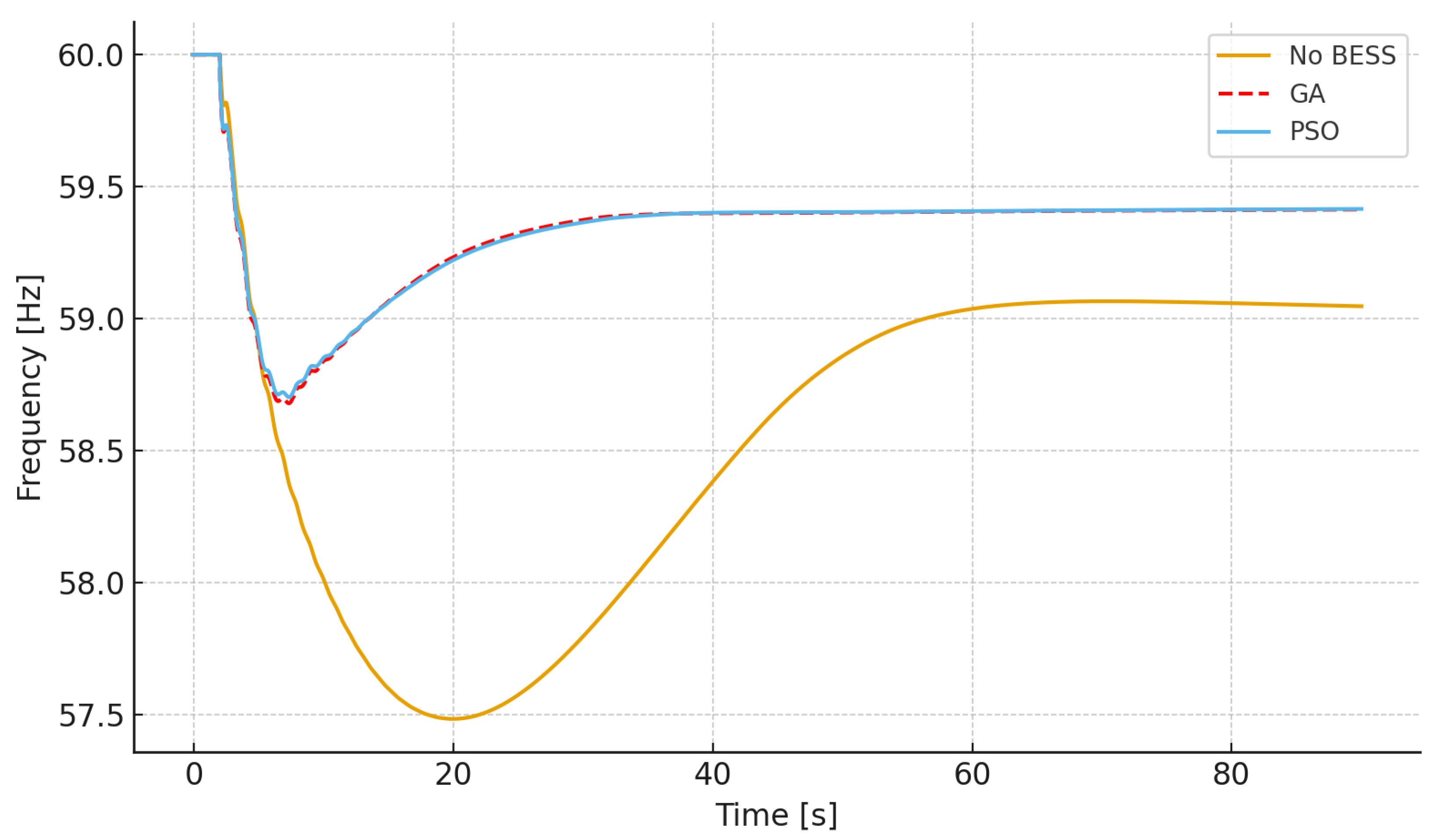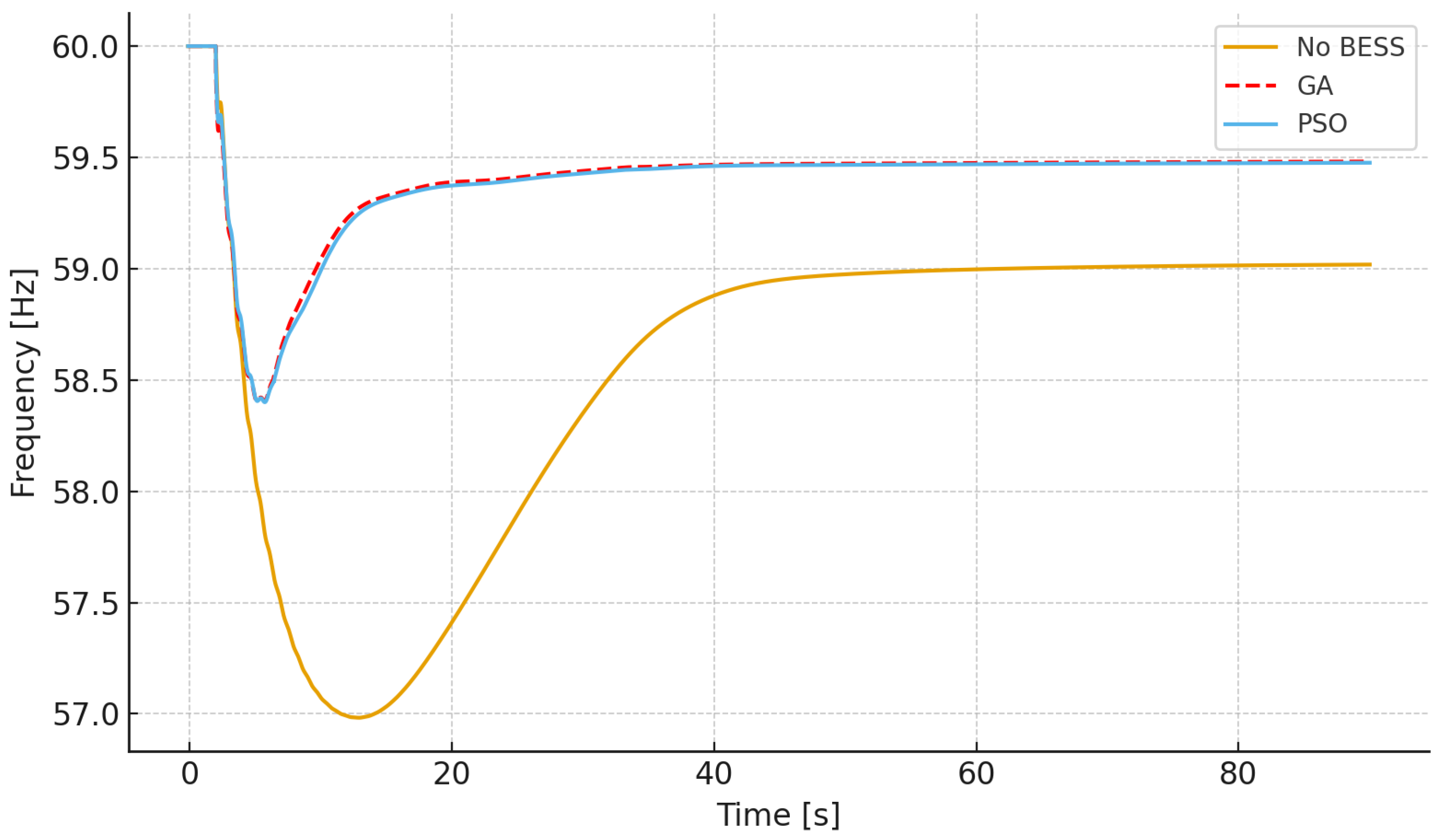 43], an optimization approach for BESS placement and sizing was developed using metaheuristic algorithms such as PSO, Firefly Algorithm, and Bat Algorithm, showing improvements in frequency stability. In ref. [