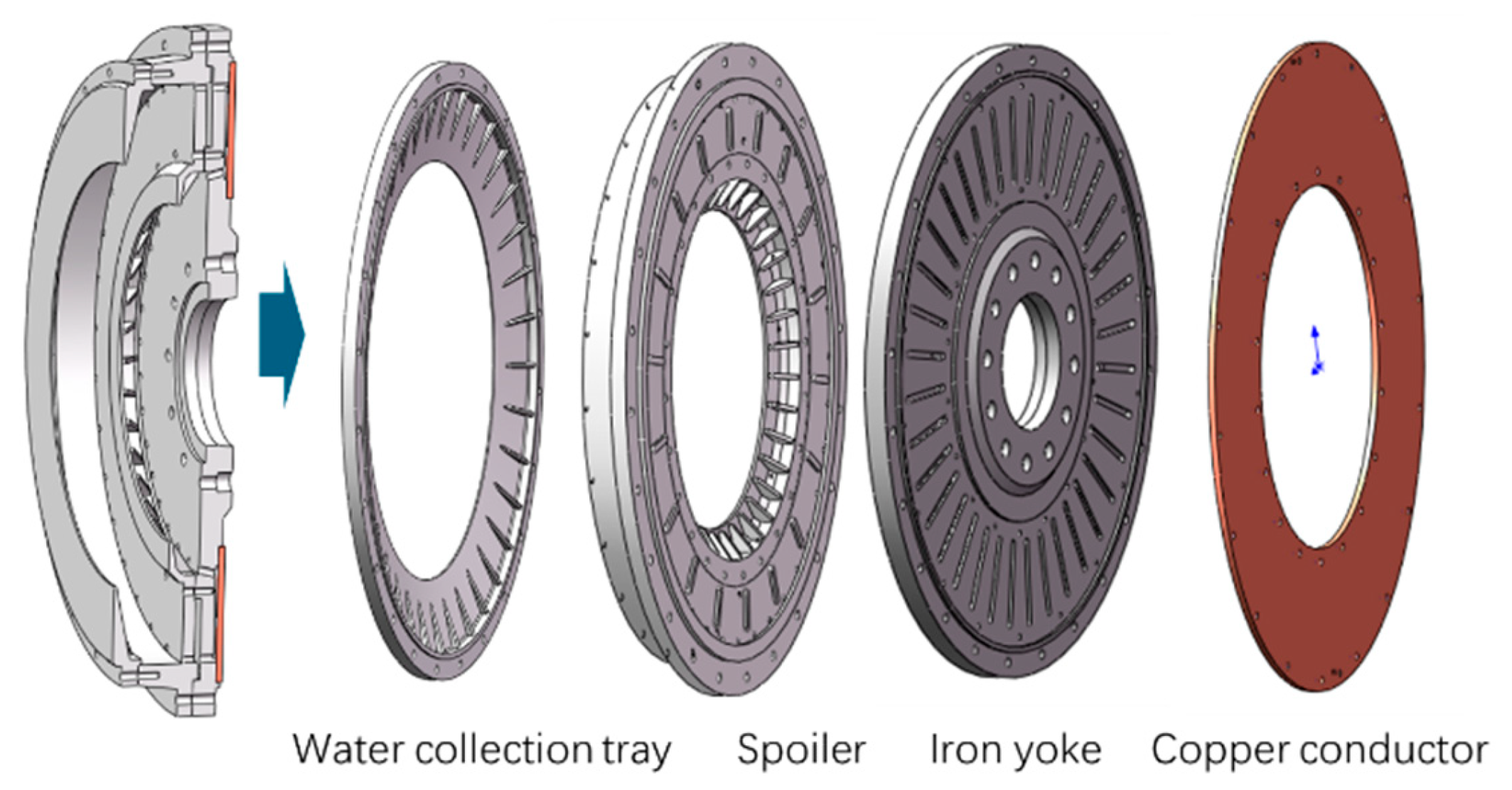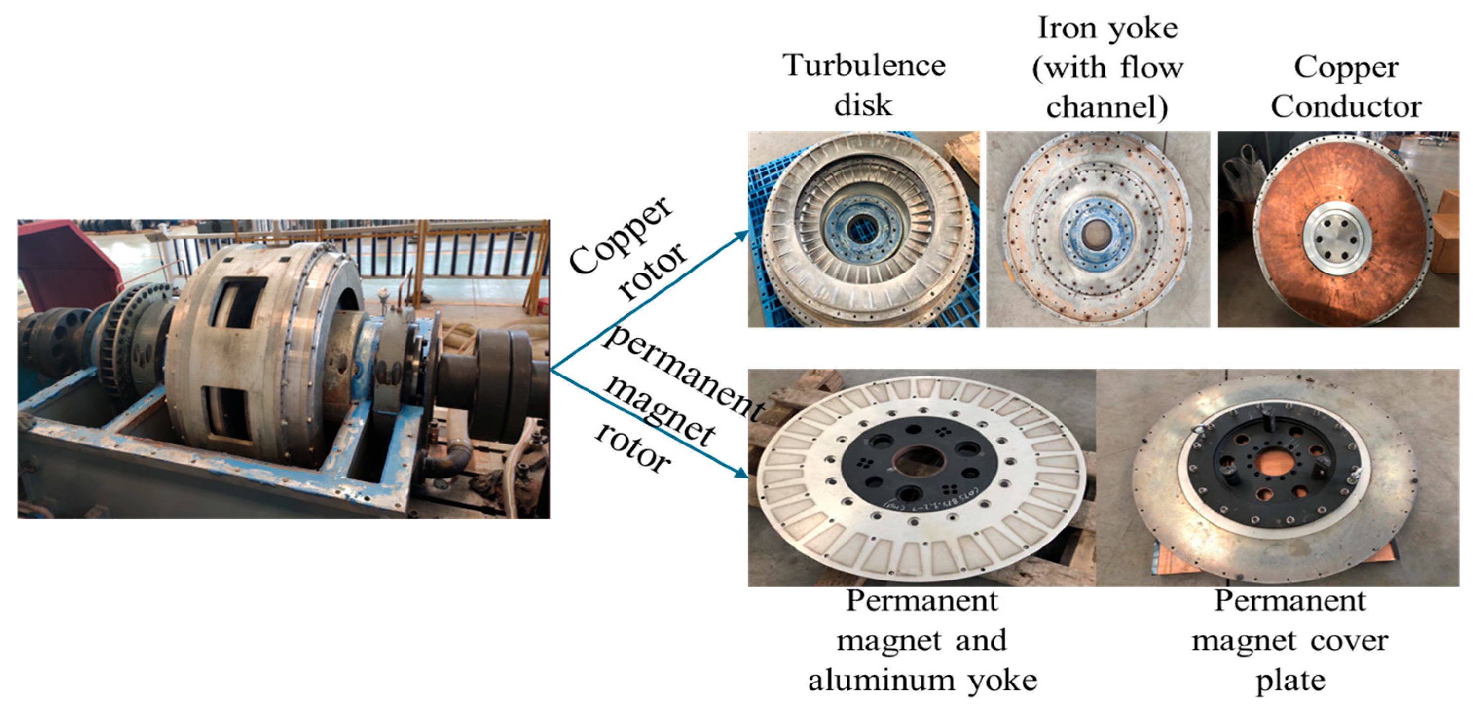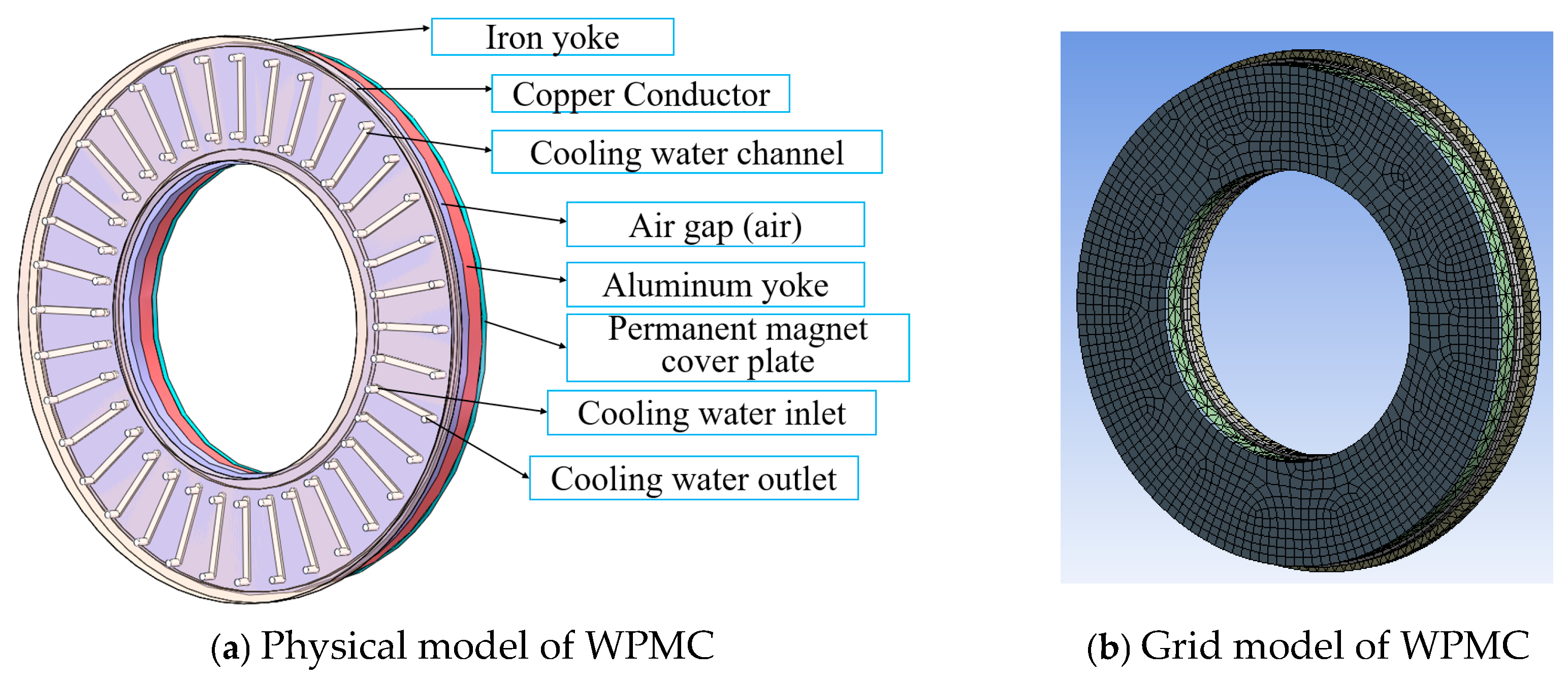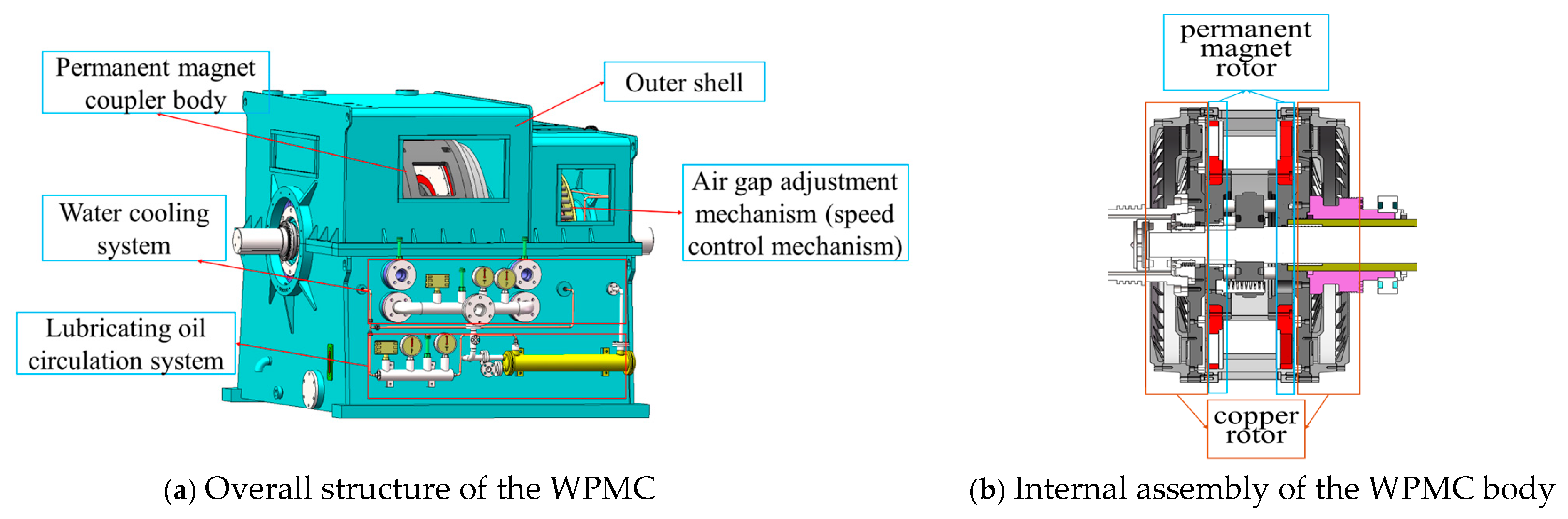 - Song, K.; Ni, Y.; Li, Y.; Zhang, S.; Qi, Y.; Kong, D.; Wang, D.; Wang, J.; Li, W.; Wang, S. Analysis of Heat Dissipation Structure of Permanent Magnet Eddy Current Coupler Based on Magnetothermal Multi-physics Coupling. In Proceedings of the 2024 36th Chinese Control and Decision Conference (CCDC), Xi’an, China, 25–27 May 2024; pp. 1–6. [Google Scholar]