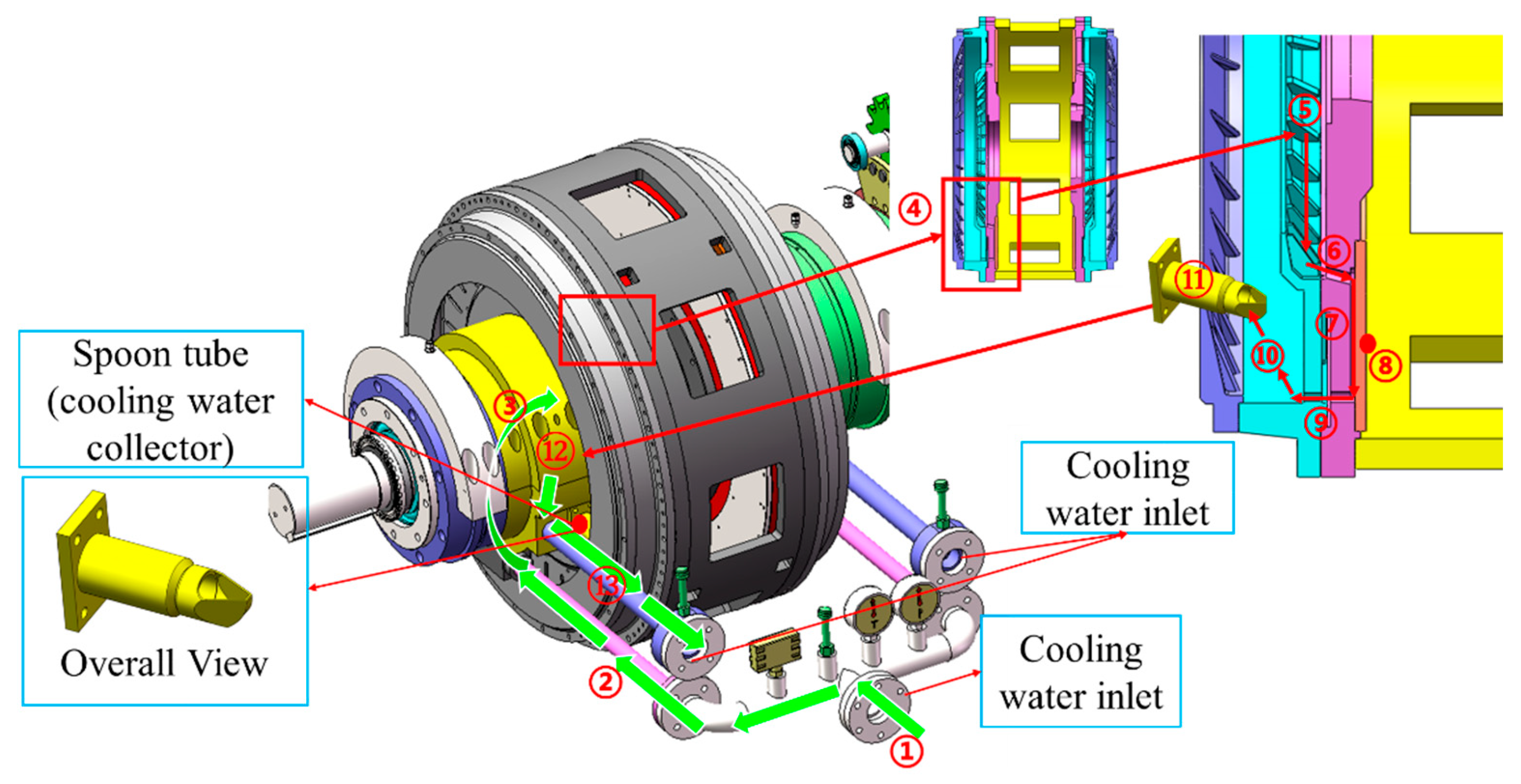- Zhang, K.; Qi, Y.; Le, B.; Feng, Z. Design and Experimental Study of Water Cooling System for External Rotor Permanent Magnet Synchronous Motor. IEEE Access 2024, 12, 88034–88047. [Google Scholar] [CrossRef]