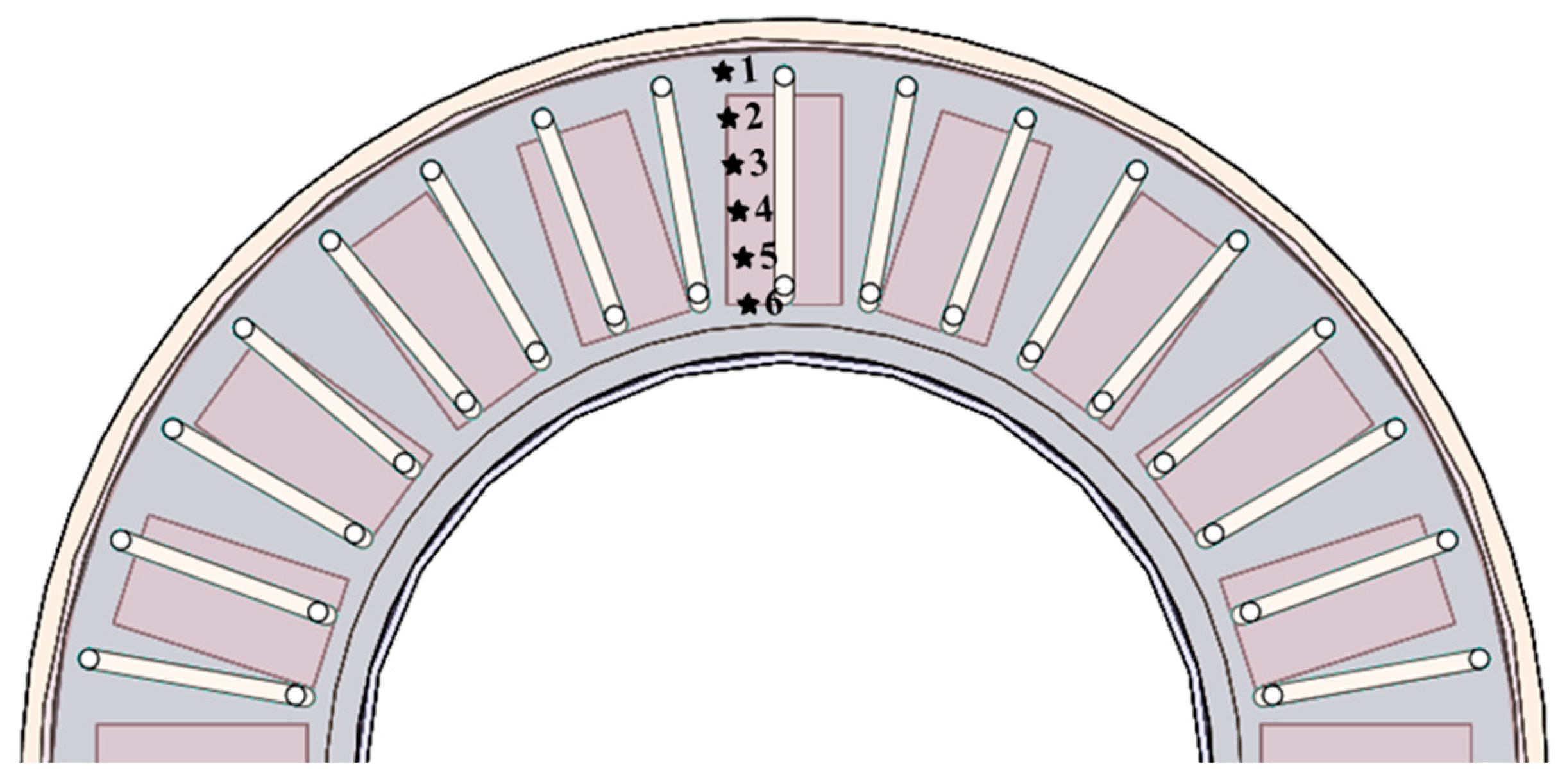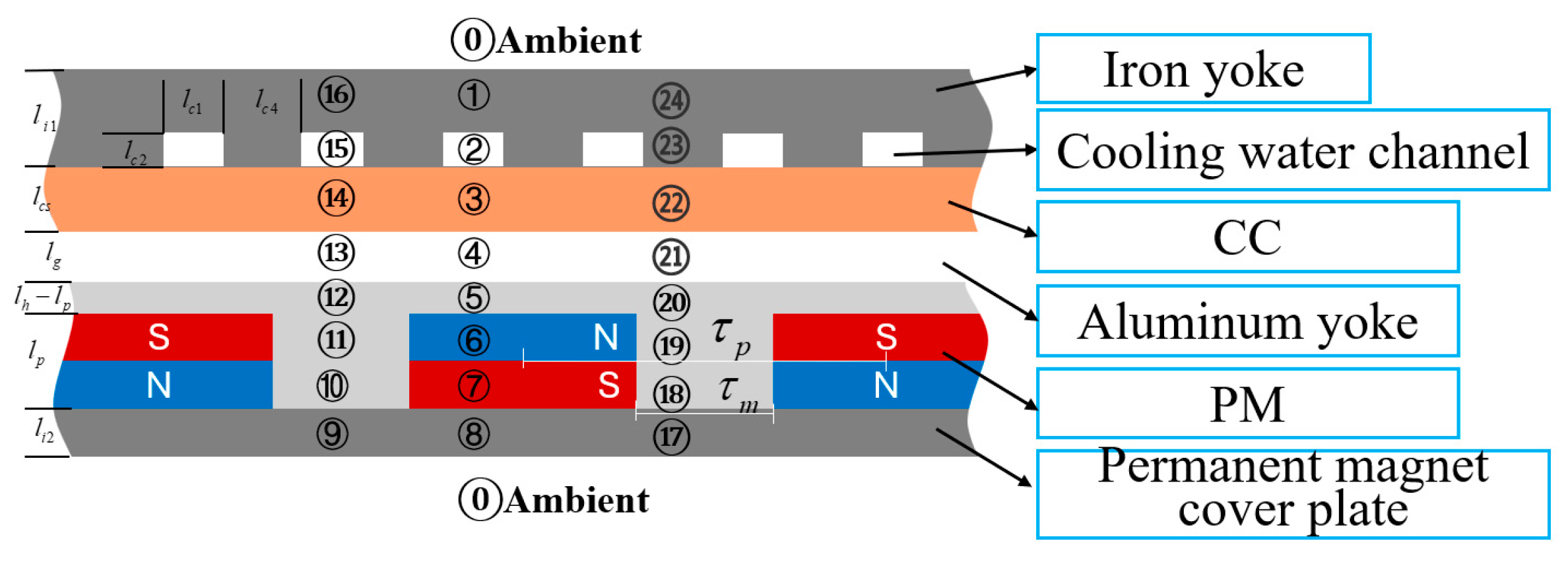 - Gao, L.; Liu, X.; Liu, H. Analytical Calculation of Magnetic Field and Temperature Field of Surface Mounted Permanent Magnet Synchronous Motor. J. Electr. Eng. Technol. 2024, 20, 2249–2262. [Google Scholar] [CrossRef]