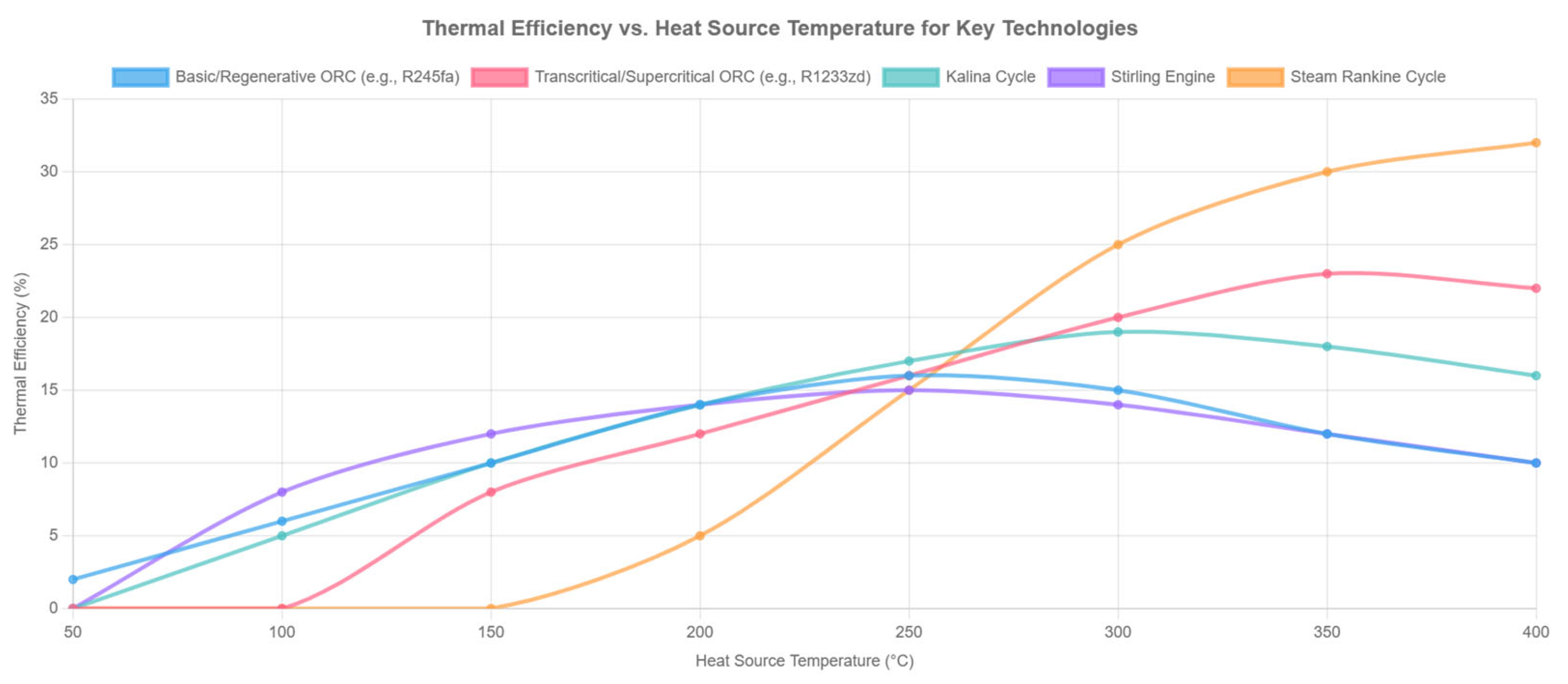 | Regenerative | Uses an internal heat exchanger to preheat fluid with turbine exhaust heat | R245fa | 12–15% [82] |