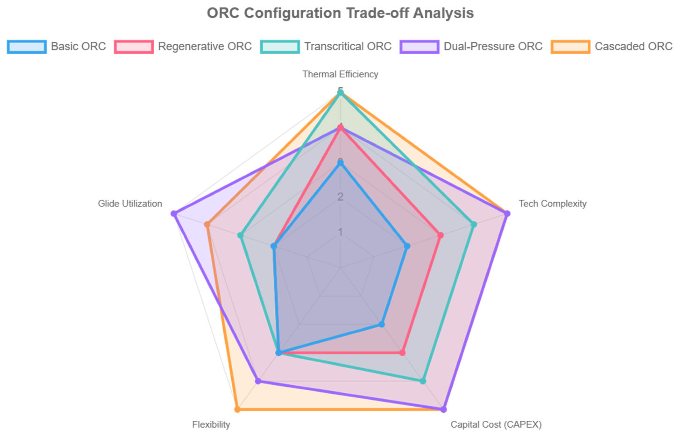 - thermodynamic configurations (basic, regenerative, supercritical, cascaded, multi-source),