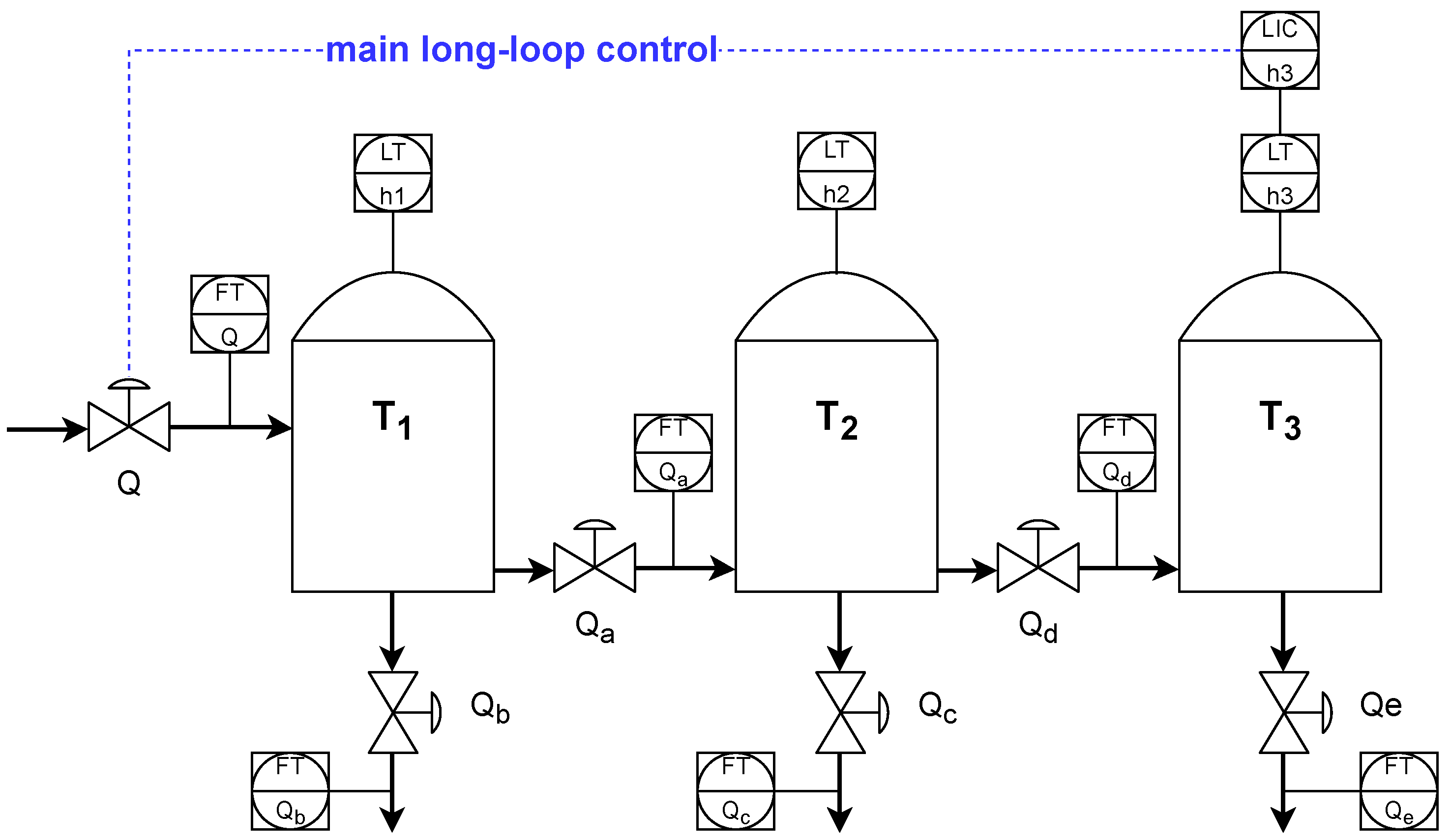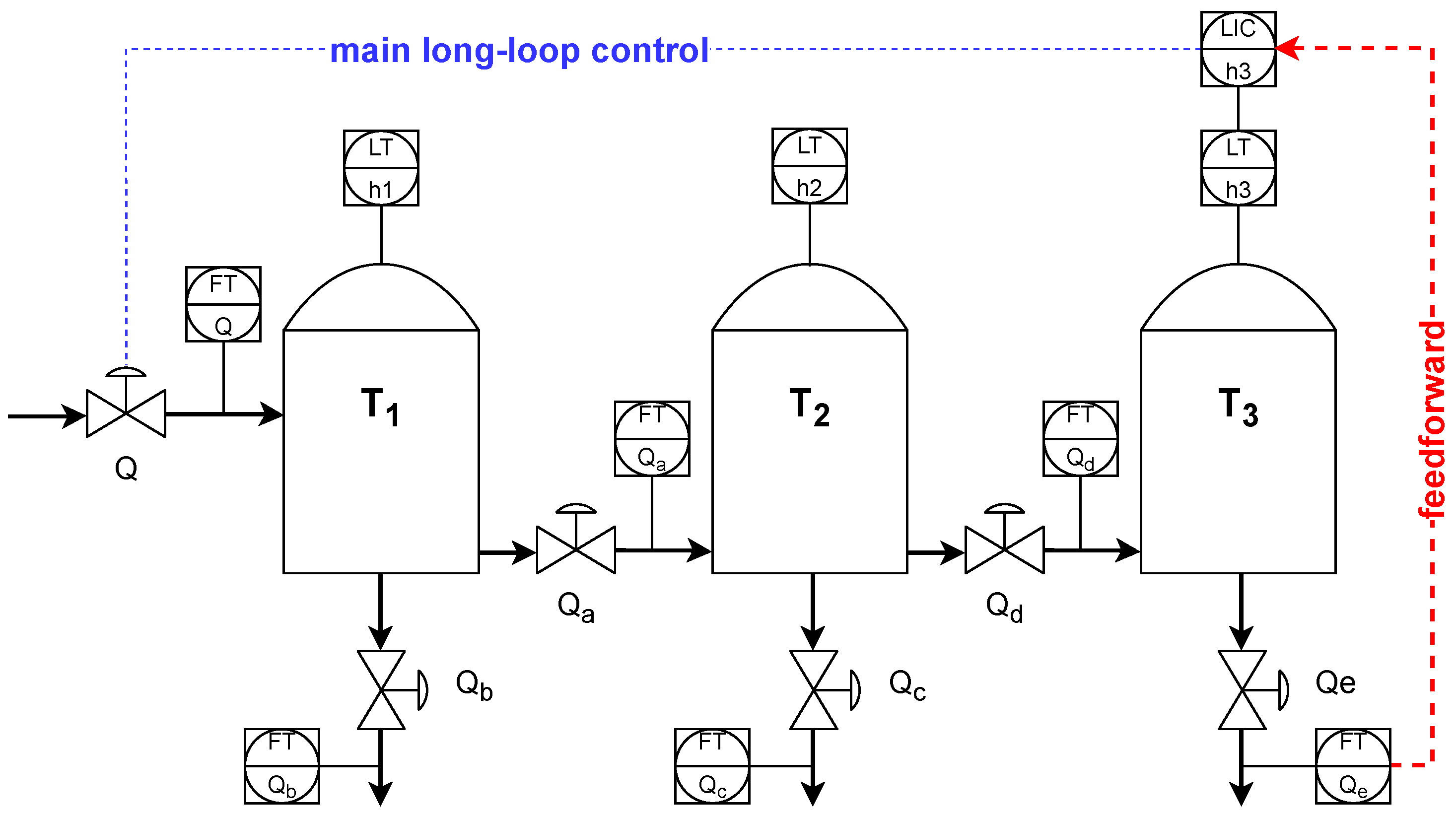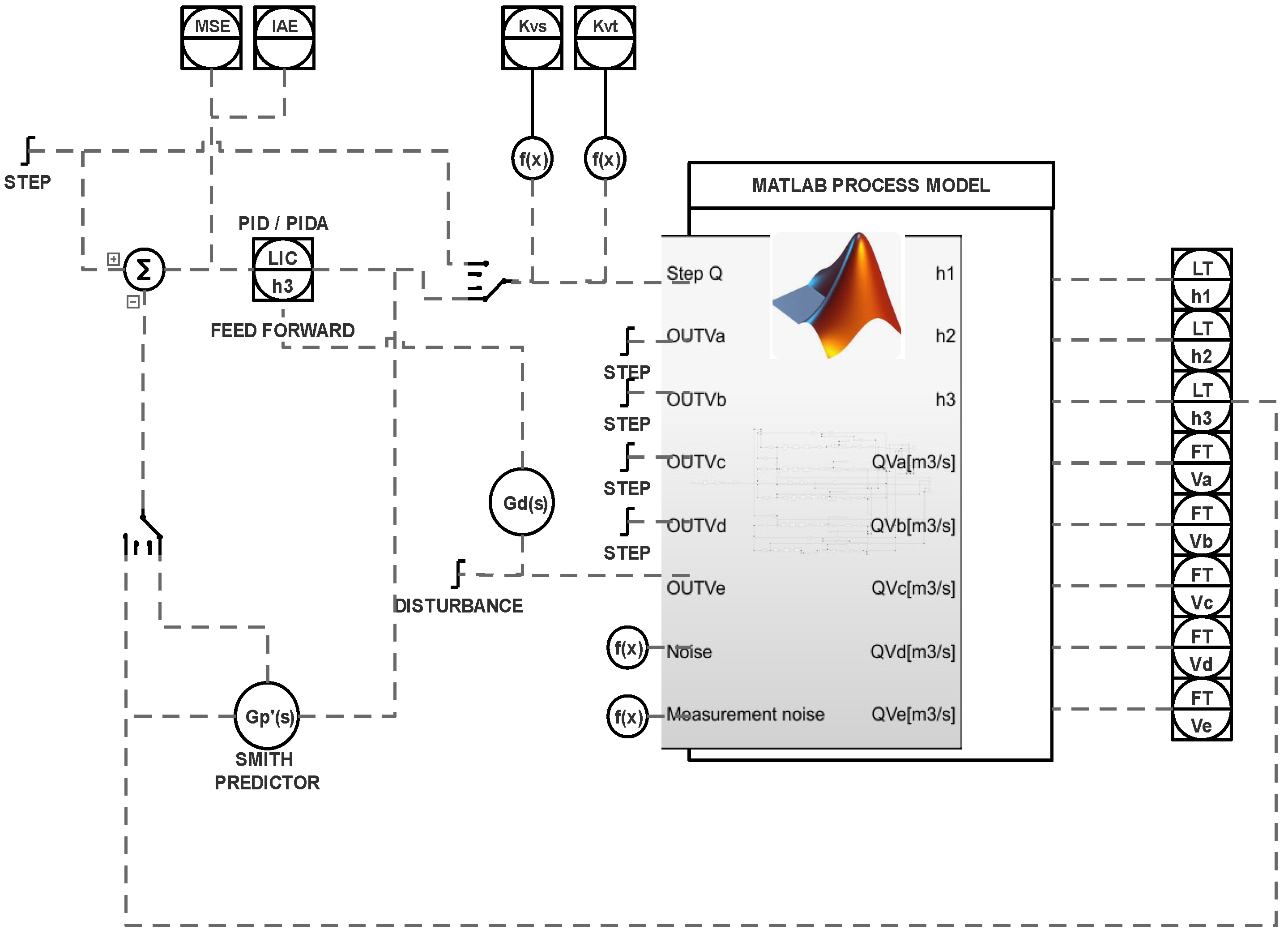 The model is constructed in a similar way in both control configurations. Based on control signals for valves () and pump load P (opening of Q valve), the model calculates the instantaneous values of the levels in each of the tanks ( in tank ; in tank ; in tank ) and flows: FTQ flow at valve Q, , which are outflows from tanks , , , and , which are flows between tanks , . The long loop version uses a Smith predictor, static, and dynamic feedforward disturbance compensation due to dead time.