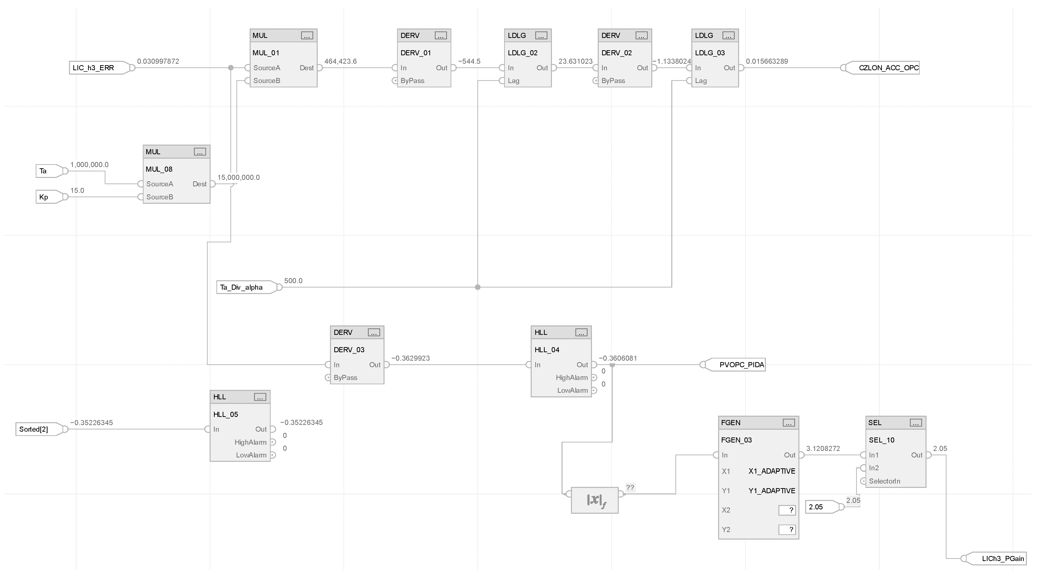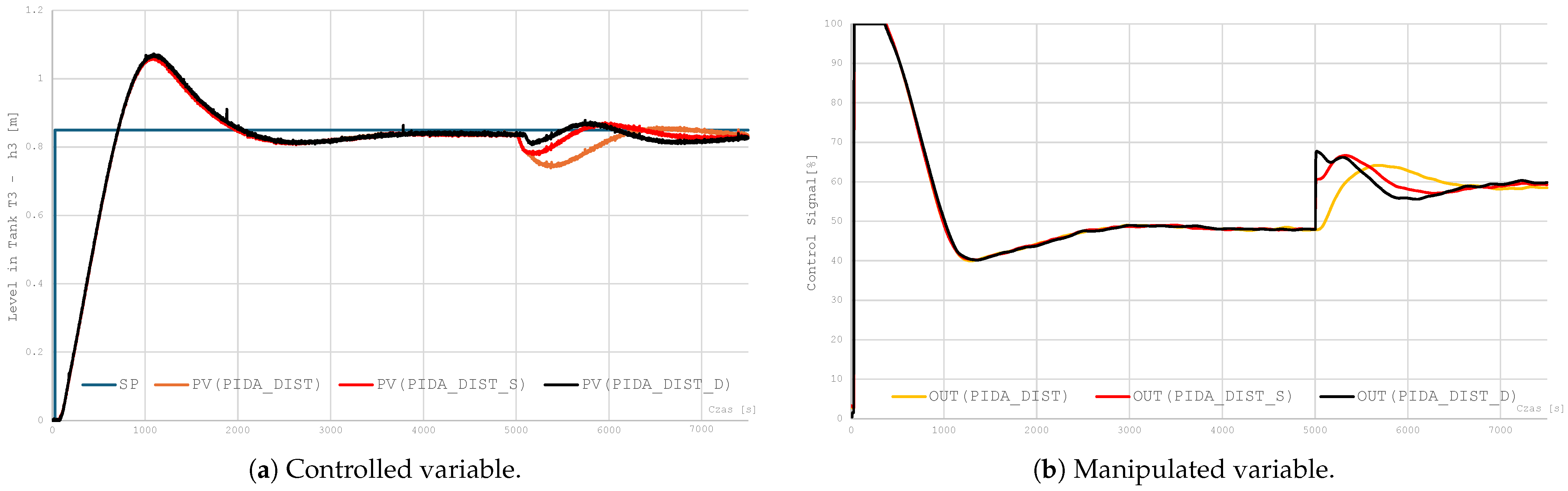 The complex structure of the PIDA controller significantly increases the number of parameters requiring tuning: in addition to the standard dynamic parameters of the PID controller , , and , it is also necessary to select the gain of the acceleration term , differential filtering constant , and parameters of the PV filters. The implementation of the PIDA controller in the DCS system is carried out exclusively on the basis of standard function blocks available in the software, which significantly facilitates its programming and at the same time reduces the risk of implementation errors. The algorithm is expanded with additional differentiation and filtering maintaining readability of the control code.