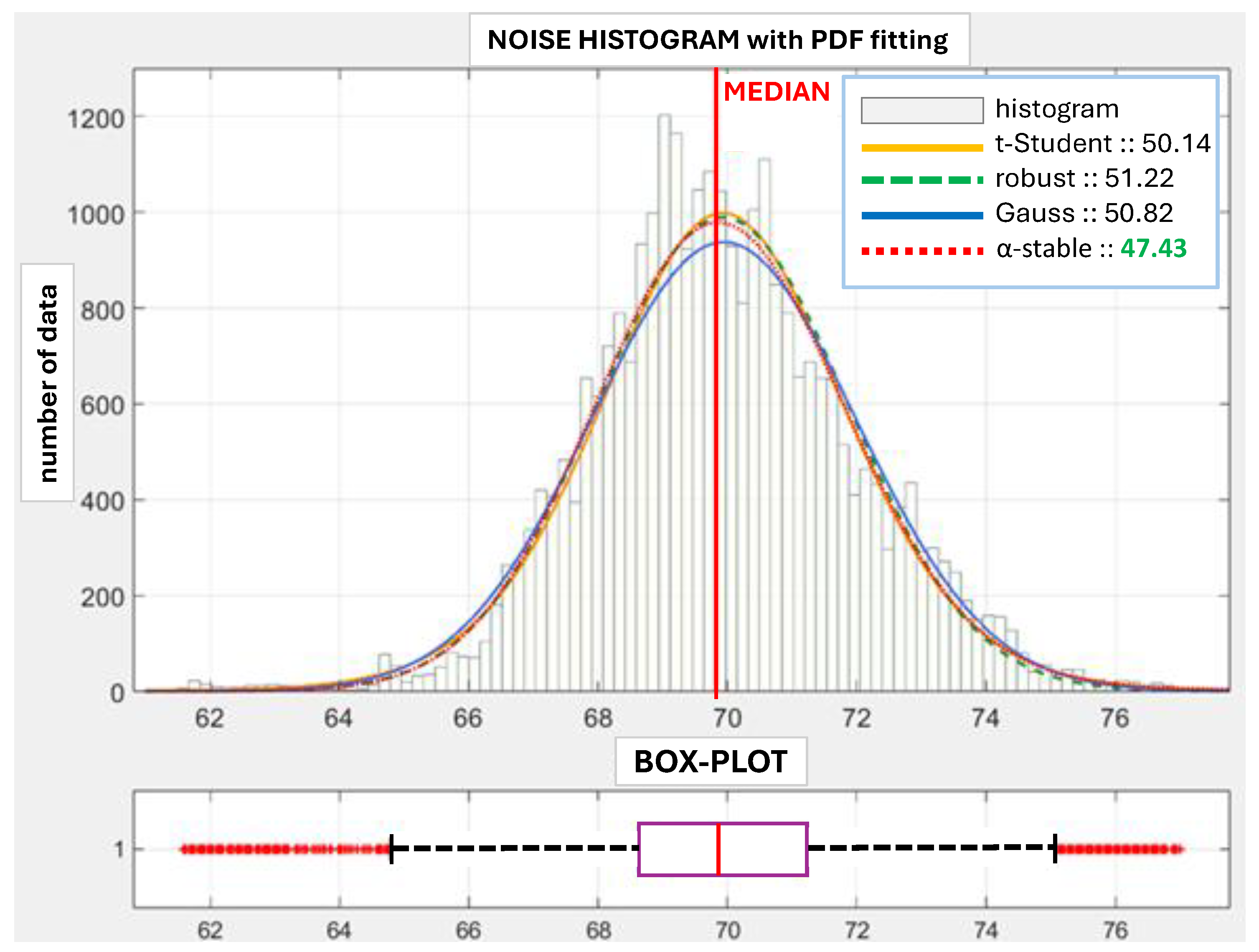 The model takes into consideration the presence of real noises. Noises’ stochastic character in the form of the respective probabilistic density function (PDF) is identified using real plant data. It enables authentic measurement conditions to be kept. The noise is modeled using a random number generator with an -stable distribution [44]: