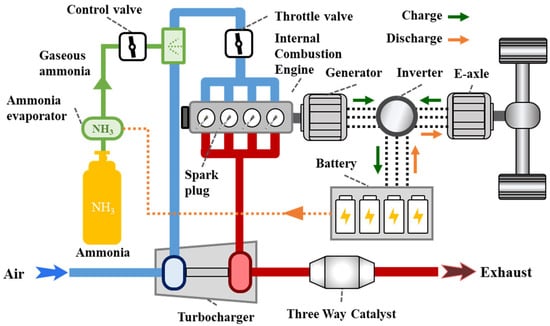 Against the global backdrop of striving to achieve carbon neutrality, the transition to clean and low-carbon energy in the transportation sector has become an urgent priority. The carbon emissions of internal combustion engines present a critical issue, making the search for and application of green, sustainable alternative fuels paramount. Ammonia (NH3), serving as an ideal hydrogen carrier and zero-carbon fuel, demonstrates significant application potential [1,2,3,4,5]. From a life-cycle assessment perspective, ammonia fuel demonstrates significant carbon reduction potential across various applications, including vehicles [6,7], ships [8,9], and electricity production [6], when produced via appropriate methods. In the passenger vehicle sector, research by Bicer et al. [6] indicated that while conventional gasoline vehicles emit approximately 270 g/km of greenhouse gases, ammonia-powered vehicles emit only 100 g/km, highlighting a substantial reduction. Furthermore, Boero et al. [7] conducted a comprehensive life-cycle assessment of ammonia-fueled internal combustion engine passenger vehicles, evaluating the vehicle, infrastructure, energy production, and operation phases. Their results show that ammonia fuel can significantly reduce global warming potential, fossil resource depletion potential, and ozone depletion potential. Leveraging these advantages, ammonia fuel stands as an ideal fuel for range extenders in extended-range hybrid electric vehicles, exhibiting considerable development prospects.