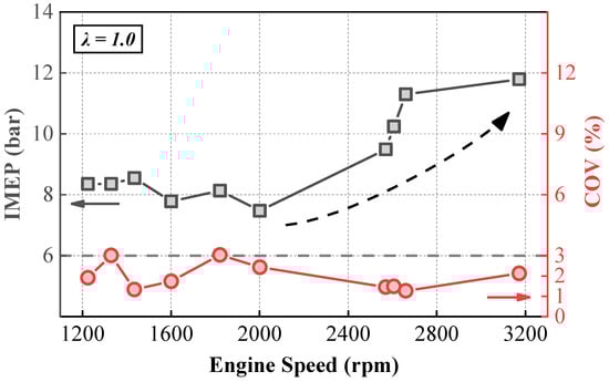 Figure 3 illustrates the variation in IMEP and the COV with engine speed. This study achieved stable operation of a four-cylinder vehicle engine across a speed range from 1200 rpm to 3175 rpm, with the COV remaining below 3% from low-medium to high speeds. However, regarding the IMEP at different speeds, the engine could maintain stability with an IMEP of around 8 bar in the 1200 to 2000 rpm range, whereas in the 2500 rpm to 3175 rpm range, the IMEP needed to exceed 10 bar to ensure stable operation. The rise in turbulence intensity within the cylinder at high speeds affects the formation of the initial flame kernel, making it susceptible to extinction by high-speed airflow. Therefore, at higher engine speeds, a higher IMEP is required to increase the combustion temperature and enhance combustion stability, which has been reported in previous studies [31,32,33] similarly.
