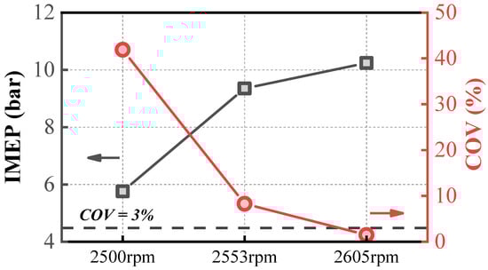 Figure 4 analyzes the variation patterns of IMEP and the COV under three operating conditions. As shown in Figure 4, IMEP and the COV exhibit opposite trends. As IMEP gradually increases, the combustion temperature rises, enhancing the stability of ammonia combustion and resulting in a gradual decrease in the COV. When IMEP is at 6 bar, the COV exceeds 40%, whereas when IMEP exceeds 10 bar, the COV drops below 3%, indicating stable operation. IMEP is a critical parameter influencing the stability of ammonia engines [27,34,35,36]. Under current engine conditions, achieving stable combustion at low IMEP remains a significant challenge. However, pure ammonia engines operating stably under high IMEP conditions can still be applied in scenarios such as range-extender engines and stationary power generation.
