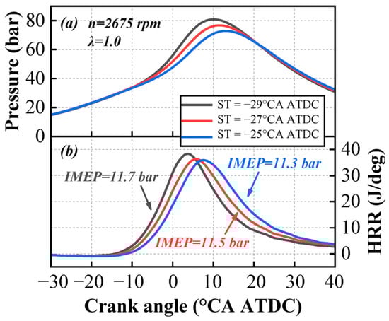 The cylinder pressure and heat release rate curves with different spark timings are shown in Figure 5. As the spark timing is retarded from −29 °CA ATDC to −25 °CA ATDC, the peak values of both cylinder pressure and the heat release rate gradually decrease, and the phases corresponding to these peaks are progressively delayed. The overall shape of the heat release rate curve remains unchanged.