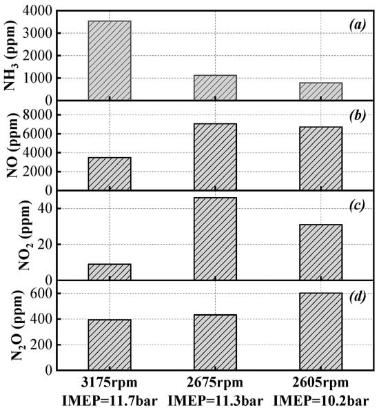 NH3 (a), NO (b), NO2 (c), and N2O (d) emissions after post-treatment under three operating conditions.