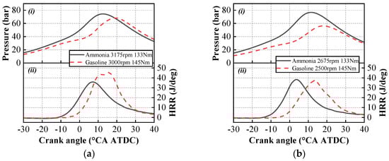 Variation in in-cylinder pressure (i) and heat release rate (ii) of gasoline and pure ammonia under similar operating conditions: (a) the operating condition of 3000 rpm; (b) the operating condition of 2500 rpm.