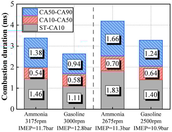 Figure 10 compares the combustion duration of gasoline and pure ammonia under two operating conditions. It can be observed in Figure 10 that the ignition delay and slow combustion duration (CA50-CA90) of pure ammonia are significantly longer than those of gasoline. However, the fast combustion duration, defined as CA10-CA50, is similar for both pure ammonia and gasoline. Under low-temperature conditions, the initial dehydrogenation reaction of ammonia proceeds at a slow rate [41,42,43]. Consequently, the ignition delay period is prolonged. Under high-speed and high-tumble-ratio conditions, the turbulent flame speed increases significantly, which enhances the propagation of the ammonia flame. As a result, the rapid combustion phase becomes comparable to that of gasoline. During the later stages of combustion, as the piston descends, the in-cylinder temperature of ammonia combustion decreases compared to gasoline, leading to an extended slow-burning phase [44]. This phenomenon indicates that under suitable operating conditions and engine design, ammonia fuel can serve as a substitute for gasoline.