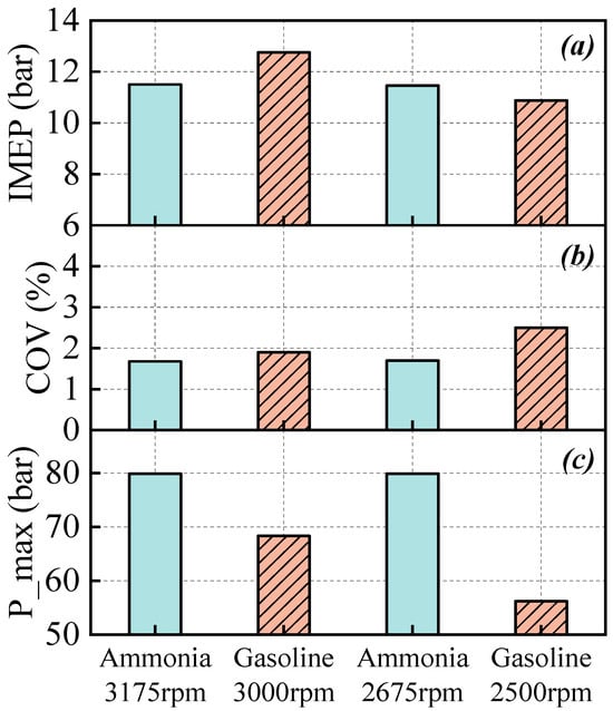 The IMEP (a), COV (b) and maximum of in-cylinder pressure (c) under gasoline and pure ammonia operations.