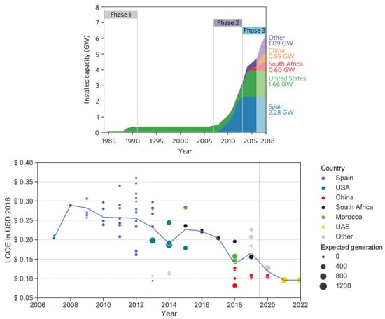 From the beginning of the 1990s to the present day, technological startups focused on renewable energy have sought to improve the commercialization of this technology. However, success has been limited due to competition and its technological immaturity. Nowadays, the need for clean, renewable, and controllable solutions for the production of heat and electricity, while avoiding the use of expensive and scarce raw materials, has driven the research and development of Concentrated Solar Thermal (CST) systems. Inside the renewable energy systems, CSP technology is particularly attractive when compared with hydropower systems (usually associated with environmental problems or social objections), with wind turbines (associated with higher emissions), and with photovoltaic facilities (associated with intermittencies and with less time-consuming services). Figure 2 shows an illustrative view of the evolution in both installed capacity and the corresponding Levelized Cost of Electricity (LCoE).