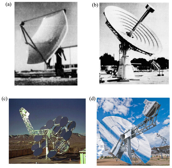 Real collectors aim to approximate the ideal parabolic shape using multiple reflective facets mounted on a truss structure [6,29]. THEK 2 (thermo-helio-electricity-kW), one of the first PDCs proven in the early 1980s, counted with triangular glass mirrors (Figure 5a), as well as SG3 Big Dish, constructed at the Australian National University (ANU) in 1994 [2]. The circumscribing shapes of both systems were hexagons, not circles. Another particular type of solar collector, recently known as discretized solar dish collector (DSDC) [7], was first implemented in the Raytheon dish by 1985 [2]. The collector consisted of spherical concentric mirror segments (see Figure 5b) that, according to the optimization study performed by Yan et al. [30], could achieve an optical efficiency of 92%. The “SunDish” dish-Stirling system, developed by the Science Applications International Corporation (SAIC) between 1997 and 1999, presented a new configuration of the mirror facets. They were placed in a staggered arrangement aiming to reduce the wind loads due to the increased porosity [2] (see Figure 5c). Finally, the most modern collectors (for example, the SunCatcher system, designed by Sandia National Laboratories in 2009) are made of stamped panels arranged in a “petal” (trapezoidal-shaped facets) arrangement (Figure 5d).