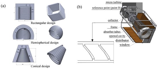 Tubular receivers: (a) Different geometries for molten salt tubular receivers integrated into a PDC [48], (b) SolHyCo tubular receiver and wire-coiled tube [43,56].