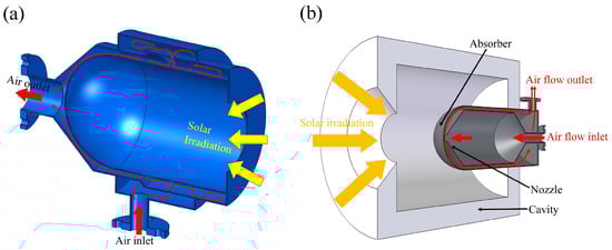 This kind of solar receiver is conformed of a metallic cavity where the sunbeams arrive to heat up the surface. The thermal energy is transferred by conduction to the cavity’s inner wall, where a fluid is forced to flow. At the time that the fluid is absorbing the heat, the cavity inner wall is cooled down, avoiding damage (Figure 9a). Wang et al. [42] carefully analyzed the performance of an impinging solar receiver whose internal cavity was made of stainless steel. The receiver withstands temperatures up to 1150 °C under atmospheric conditions. The measured thermal efficiency ranged from 81.5% to almost 88%, depending on the radiative flux and the effective cavity diameter. Later, a new concept of impinging receivers was developed. Instead of following a radial configuration, where the absorbing fluid cylindrically surrounded the impingement cavity, an axial configuration was proposed [62] and geometrically optimized [63] (Figure 9b). This axial geometry consists of a refractive cavity that traps solar radiation, acting as a secondary concentrator. In the center of the cavity, a solar absorber made of alloy is placed coaxially. The radiation strikes it, heating it and transferring the thermal energy to the compressed air flowing inside. Some of the advantages of this last configuration include significant cost savings from reducing the amount of high-heat-resistant absorbing material. Furthermore, a simpler configuration reduces manufacturing complexity, thereby further reducing costs [63].