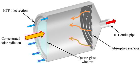 Solar receiver is one of the most crucial elements within CST systems as it sets the maximum temperature achievable in the system and, for CSP installations, the maximum power cycle temperature [42] and, so, the system efficiency. The solar receiver function is to turn the solar irradiance from the collector into usable heat. However, this is not a simple task. Several heat losses occur during the heat transfer, affecting the receiver efficiency. The emerging applications of CST systems, such as the production of “solar fuels”, require high outlet temperatures from the receiver [43]. Therefore, the challenging issues for boosting the solar receiver performance are focused, among others, on geometry, for minimizing heat losses, and materials, which eventually have to withstand increasingly larger temperatures (and so, steeper temperature gradients) [13,44]. Solar receivers can be classified according to various aspects (geometry, operating pressure and temperature operation levels, heat transfer fluid, etc.).