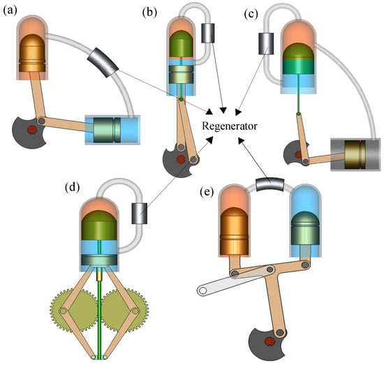 Different kinetic Stirling engines: (a) -type, (b) -type, (c) -type, (d) Rhombic drive -type and (e) Ross yoke -type. Adapted from [81].