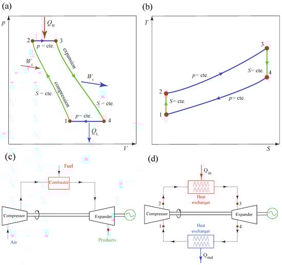 Gas turbines are based on the Brayton cycle, which converts thermal energy into mechanical energy. As presented in Figure 14a,b, the ideal cycle consists of an adiabatic gas compression, an isobaric heat absorption, an adiabatic expansion in the turbine, and finally an isobaric cooling. Conventional real gas turbines comprise a compressor, a heat source, and an expander. In the open-cycle (see Figure 14c, isobaric cooling is achieved by expelling the air to the ambient. Another configuration includes a heat exchanger with the ambient, closing the cycle (see Figure 14d). The fuel used in the combustor can be kerosene, propane, or natural gas. However, the use of biogas is gaining attention [86], as it is considered a net-zero CO2 emissions fuel. To further increase the cycle efficiency, a recuperator is usually placed connecting the compressor and the expander outlets, aiming to preheat the working fluid, which can attain temperatures up to 900–1000 °C [87].