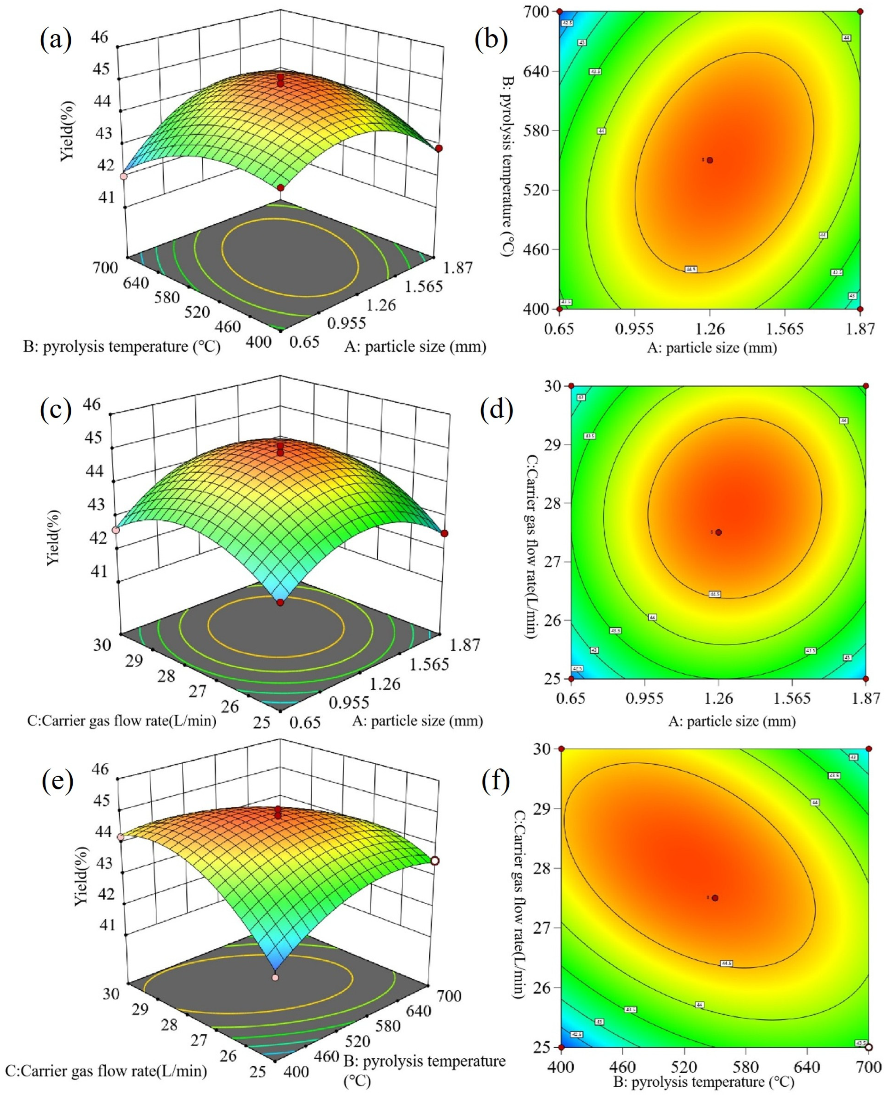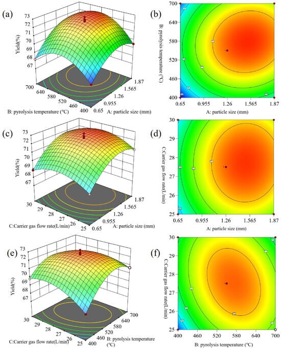 Response surface diagram of the effect of experimental conditions on the pyrolysis oil yield. (a) Response surface plot of the effect of pyrolysis temperature and particle size on the pyrolysis oil yield; (b) Contour distribution plot of pyrolysis oil yield under the interaction of pyrolysis temperature and particle size; (c) Response surface plot of the effect of carrier gas flow rate and particle size on the pyrolysis oil yield; (d) Contour distribution plot of pyrolysis oil yield under the interaction of carrier gas flow rate and particle size; (e) Response surface plot of the effect of carrier gas flow rate and pyrolysis temperature on the pyrolysis oil yield; (f) Contour distribution plot of pyrolysis oil yield under the interaction of carrier gas flow rate and pyrolysis temperature.
