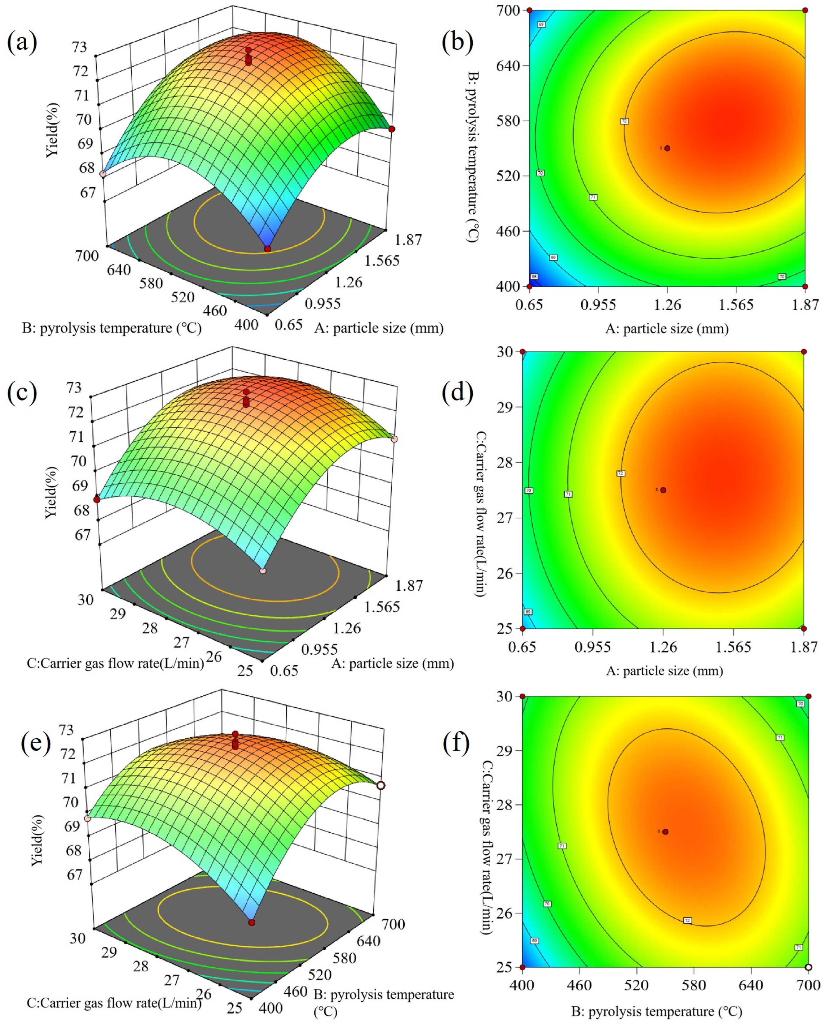 Response surface diagram of the effect of experimental conditions on the pyrolysis char yield. (a) Response surface plot of the effect of pyrolysis temperature and particle size on the pyrolysis char yield; (b) Contour distribution plot of pyrolysis char yield under the interaction of pyrolysis temperature and particle size; (c) Response surface plot of the effect of carrier gas flow rate and particle size on the pyrolysis char yield; (d) Contour distribution plot of pyrolysis char yield under the interaction of carrier gas flow rate and particle size; (e) Response surface plot of the effect of carrier gas flow rate and pyrolysis temperature on the pyrolysis char yield; (f) Contour distribution plot of pyrolysis char yield under the interaction of carrier gas flow rate and pyrolysis temperature.