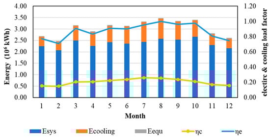 Yearly energy consumption pattern of a standard data center in Guiyang, Guizhou Province, China: Esys, energy consumption of servers; Ecooling, energy consumption of cooling system; Eequ, energy consumption of lighting and auxiliary equipment; ηe, electric load factor; ηc, cooling load factor.