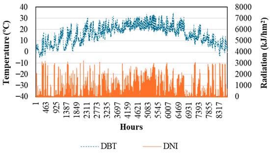 Local meteorological conditions are also considered in the analysis. The annual profiles of Direct Normal Irradiance (DNI) and ambient Dry Bulb Temperature (DBT) are presented in Figure 3. Specific data indicates that the maximum summer DBT reaches 35 °C, while the minimum winter temperature drops to approximately −4.7 °C. Regarding solar radiation, the maximum DNI value in summer is 3063.6 kJ/h·m2, and the winter maximum is slightly higher at 3229.2 kJ/h·m2. These datasets provide critical inputs for assessing the potential of renewable energy sources.