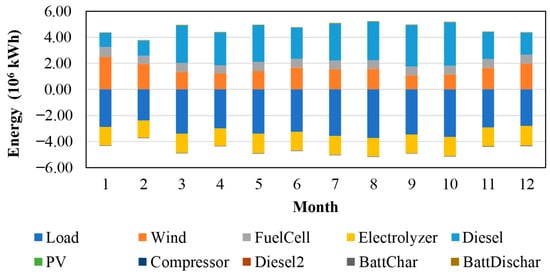 Data analysis reveals pronounced seasonal fluctuations in the monthly performance of various system components, as illustrated in Figure 6. Electricity consumption peaks during the summer months (June to August), ranging from 3.247 to 3.728 GWh. In contrast, the load is lower in the winter and spring-related months (January, February, November, and December), ranging from 2.391 to 2.871 GWh. This summer peak load is primarily attributable to the additional cooling load from air conditioning systems, superimposed on the base power load required for operating IT equipment. Statistical analysis of the case model indicates that the system’s diesel generators operate for 3208 h annually, generating 17.12 GWh, which accounts for 46.9% of the total annual power supply.