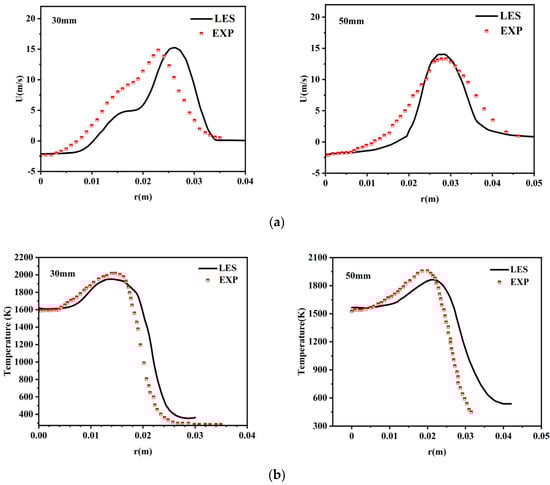 Prior to conducting formal LES investigations, the classical and representative Cambridge SWB flame is numerically simulated to validate the applicability of the adopted LES approach [24,25]. The simulation results are compared against reference data from experimental databases for verification. As illustrated in Figure 4, the velocity and temperature profiles obtained through large-eddy simulation show good agreement with experimental values, demonstrating the sound applicability and computational accuracy of the present method. For detailed information regarding this validation work, please refer to our previously published preliminary study [26].