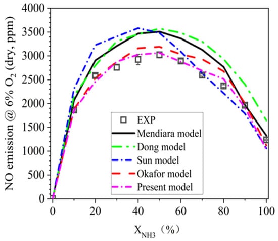 Figure 6 also indicates that, the models of Mendiara et al., Dong et al. and Sun et al. would overpredict the NO emission, especially in moderate XNH3 conditions. Okafor’s model has a much better performance than the aforementioned three candidates, but it still overpredicts the NO emission in the XNH3 range of 40~80%. As the present model is modified based on the Okafor’s model by updating the key C-N interaction reactions, which has been described in our previous work, the present model is found to satisfactorily predict the NO emissions in all XNH3 conditions.