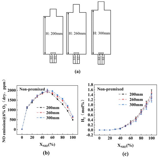 The aforementioned study found that NO emissions in the NP mode are lower than those in the FP mode. This phenomenon may be attributed to incomplete combustion of a portion of NH3, which escapes to the rear section of the combustor and undergoes pyrolysis, producing N2 and H2. To investigate whether increasing the residence time of NH3 in the combustor could improve the burnout performance of NH3 in the NP mode, combustion experiments under the NP mode are conducted at different combustor heights.