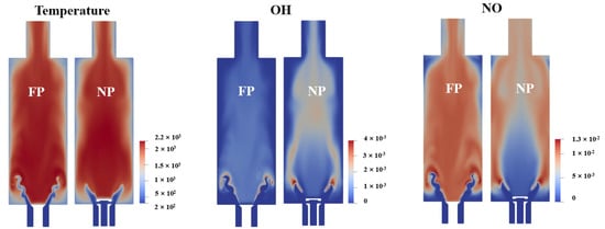 In order to gain a deeper understanding of the NO reduction mechanism for the NP flame, the LES modeling results of mean temperature and major species concentrations on the combustor central plane are compared for 50% XNH3 mixture between the two combustion modes, as shown in Figure 9 and Figure 10. The OH maps indicate that the fuel combustion mainly happens on the shear layer in the FP mode, while additionally occurring in the downstream central region. In both modes, the high NO region basically overlaps with the high OH region, which suggests the strong correlation between OH radical and NO formation, as also reported in previous studies [13,14]. However, despite the relatively higher OH concentration, NO concentration in the outlet is smaller in NP mode. The main reason is due to the reduced NO formation in the central upstream region, where a relatively low OH concentration is also presented.