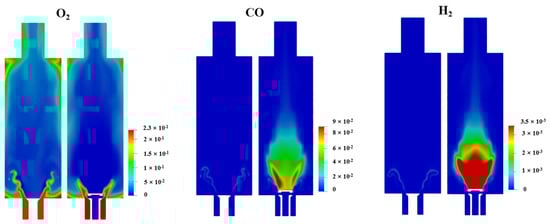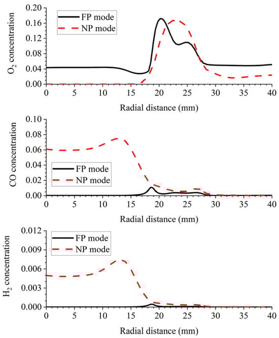 As explained in Section 3.1, the central low OH region in the NP mode is a result of the flame stratification effect. According to Figure 10, in the shear layer, a part of CH4 consumes O2 from the outer swirling air prior to NH3. Due to the deficiency of O2, a large amount of CO is formed by the partial oxidation of CH4, and H2 is formed by the thermal decomposition of NH3. To enhance the comparison, Figure 11 shows the radial concentration curves for O2, H2 and CO 20 mm above the burner exit. Obviously, O2 is maintained at 4% in the center in FP, owing to the inner flue gas recirculation. Such an atmosphere indicates the major NH3 consumption route via oxidation. Contrarily, the central fuel-rich atmosphere implies a strong thermal decomposition route of NH3 consumption in NP. This is considered to be the underlying reason for the lower NO emission in NP compared to the FP counterpart.