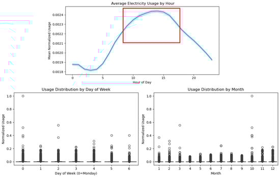 The data were sampled on an hourly basis over 12 consecutive months. As illustrated in Figure 3, after normalization, the data reveal the daily, weekly, and monthly electricity consumption of the HVAC system. The peak consumption period occurs between 10:00 and 19:00 each day.