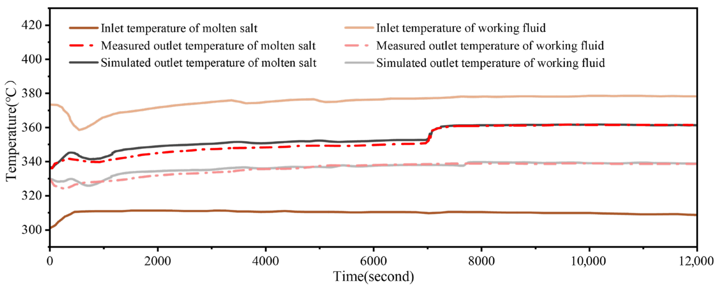 Drawing on the experimentally measured temperatures of molten salt and heat transfer medium reported in reference [28], the dynamic model of the molten salt energy storage system was further verified in this study. As illustrated in Figure 2, both the mean absolute error (MAE) and root mean square error (RMSE) of the temperature values are less than 5 °C, which demonstrates that the model can accurately simulate the dynamic behavior of molten salt energy storage systems.