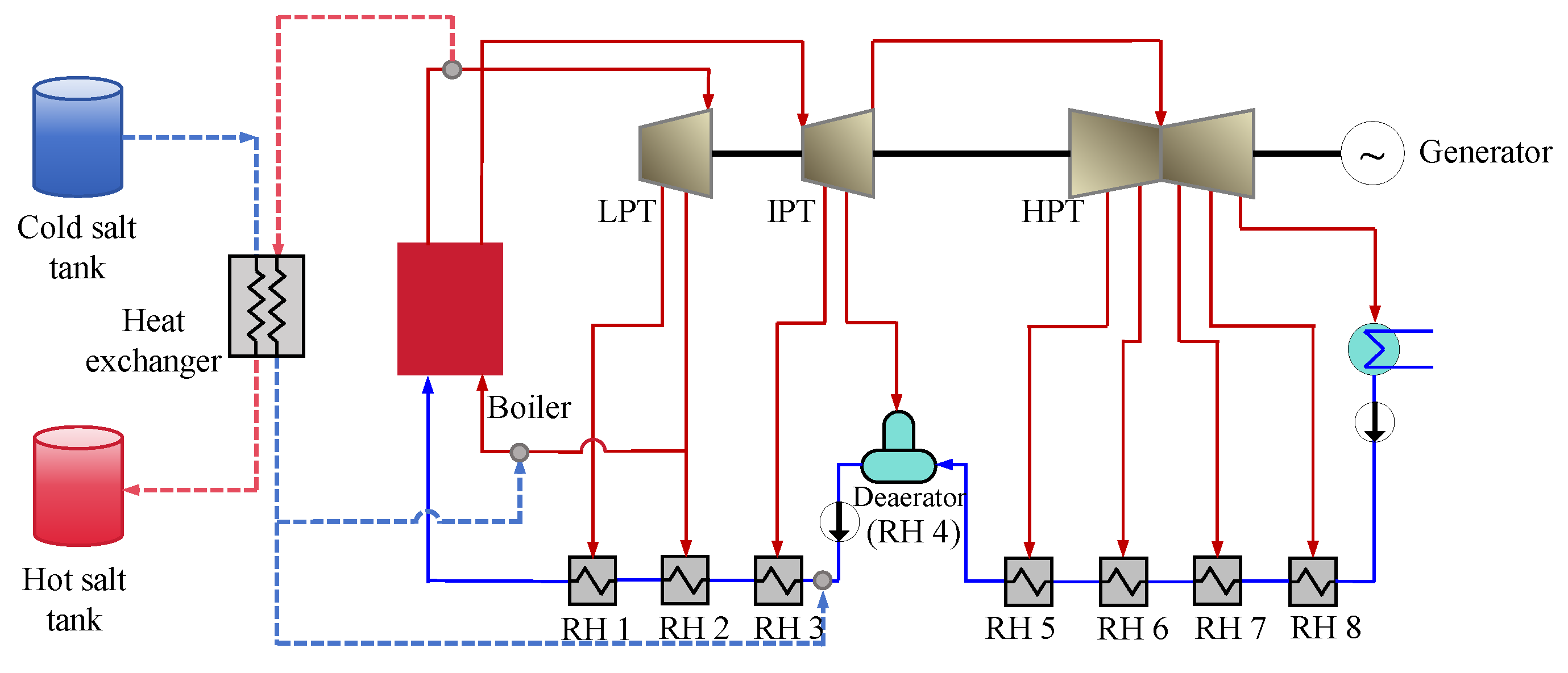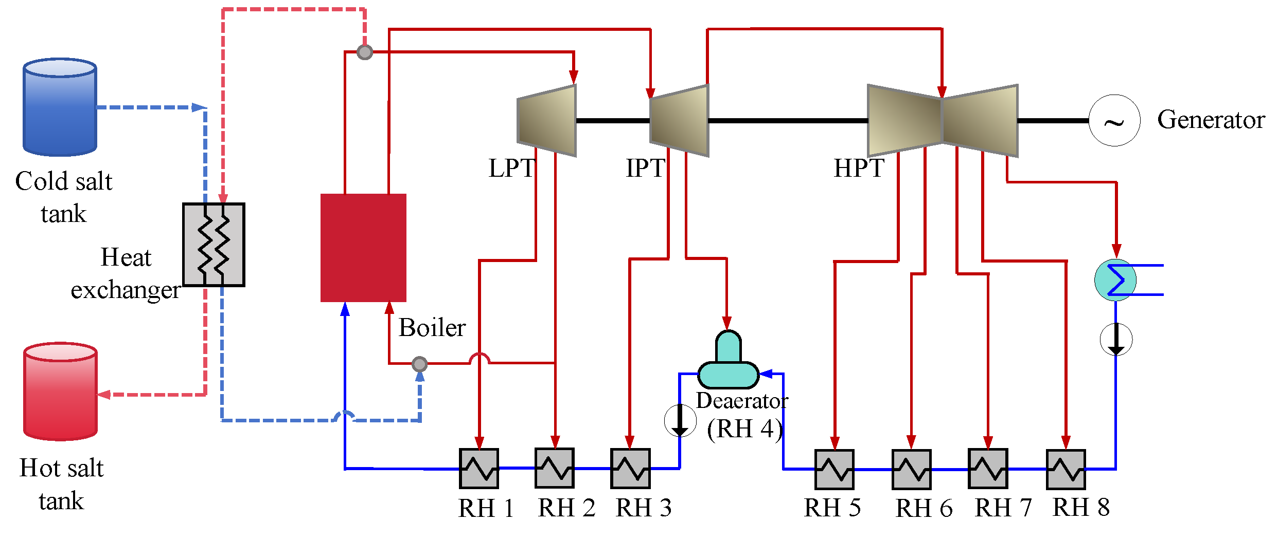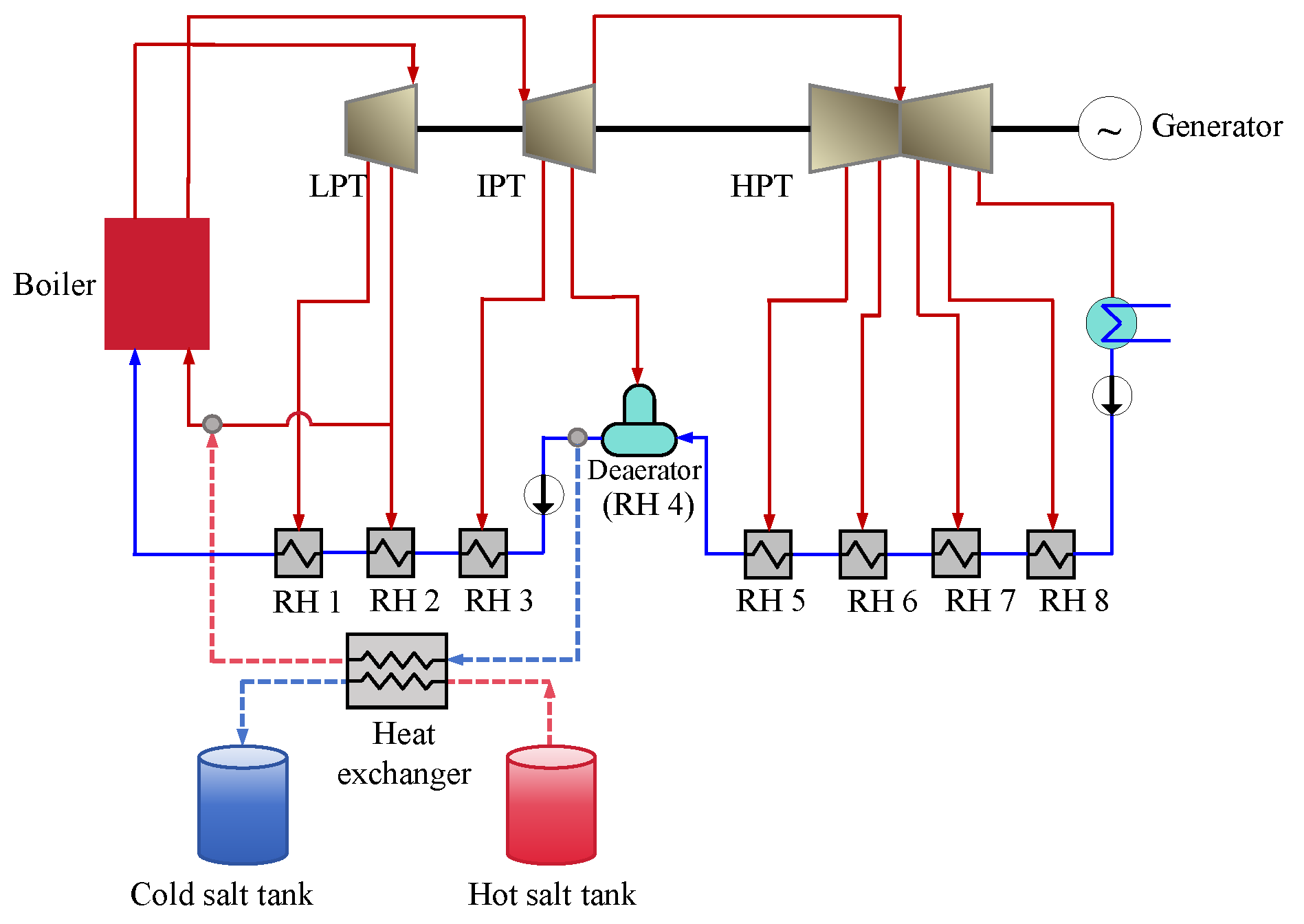 23. Jiang, K.; Wang, Q.; Liu, H.; Zhang, Q.; Mu, Z.; Niu, Y. Dynamic simulation and control strategy development of molten salt steam generation system for coal-fired power plant flexible retrofit. Case Stud. Therm. Eng. 2024, 63, 105212. [Google Scholar] [CrossRef]